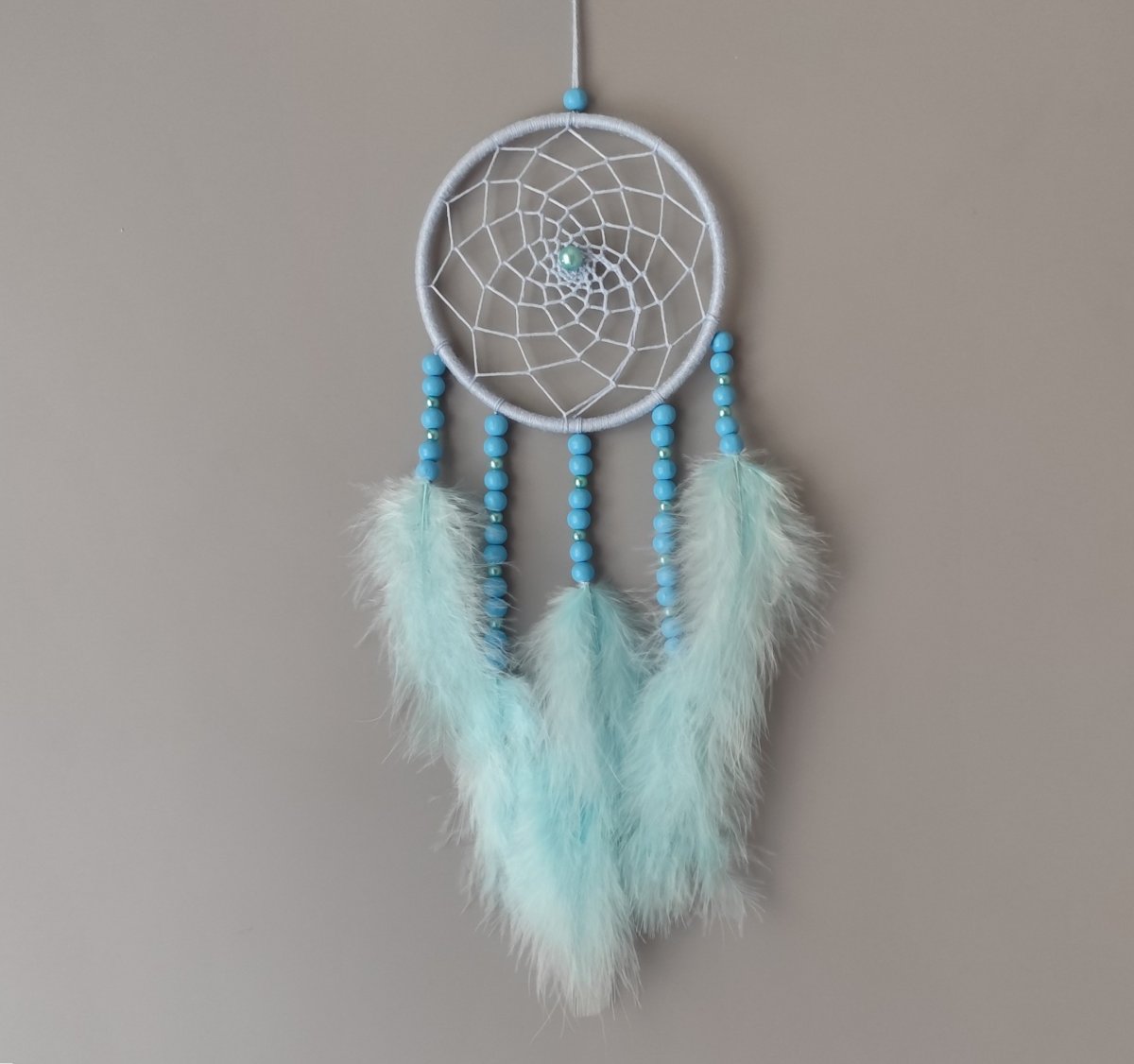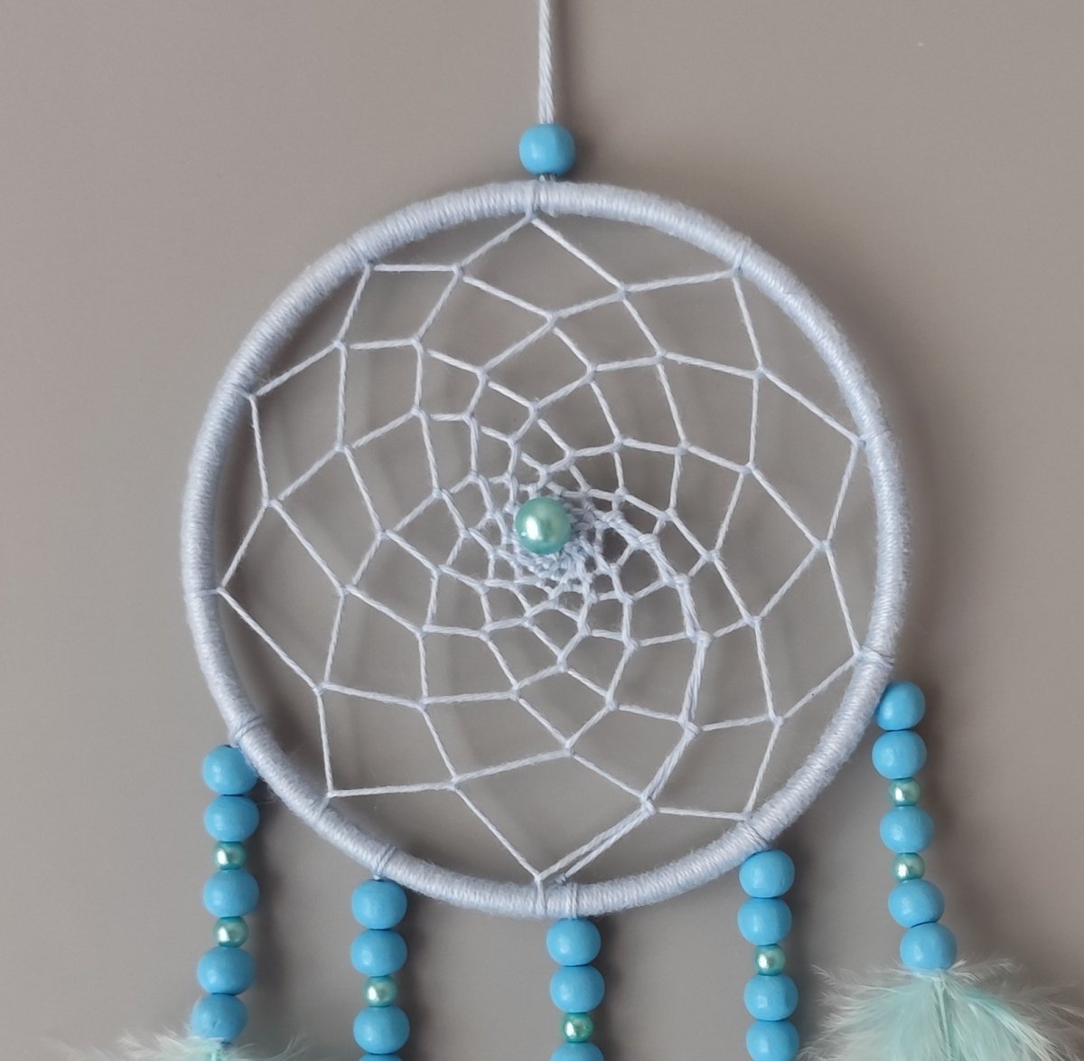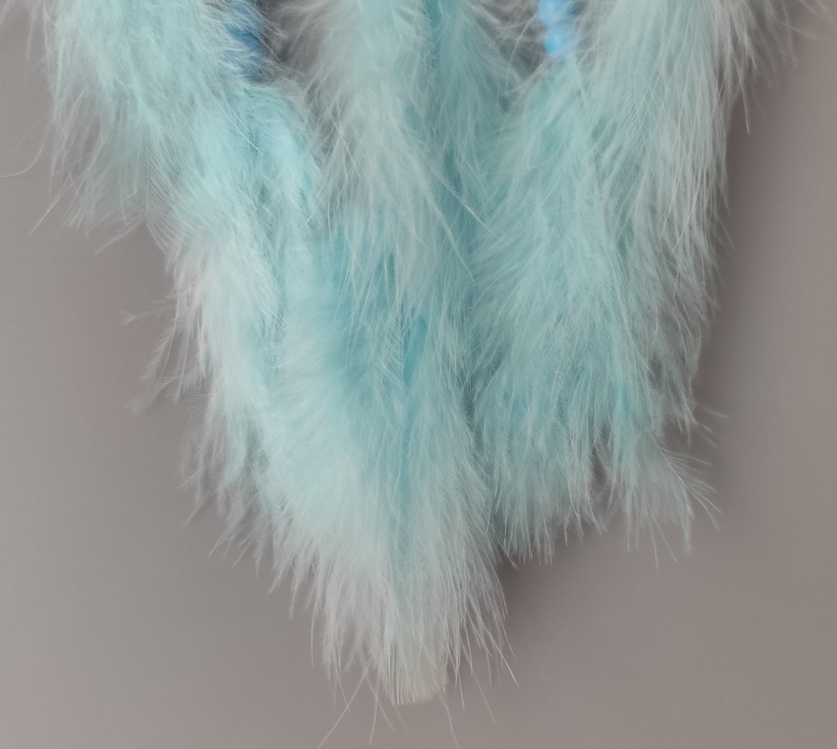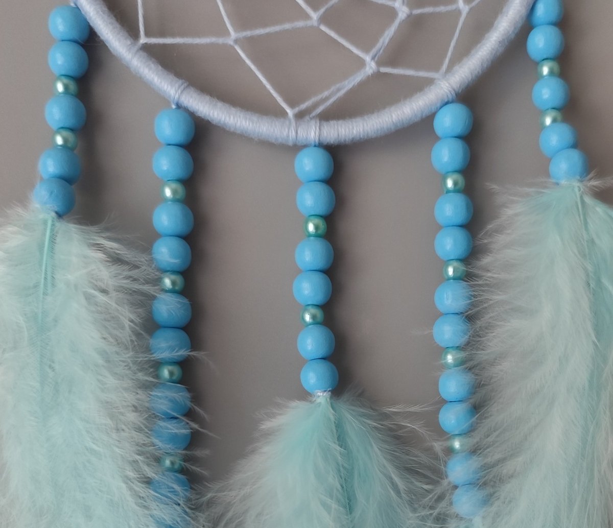 Základní kruh má průměr 10 cm a je omotán a vypleten 100% bavlnou. Na kruhu jsou na dřevěných a plastových korálcích zavěšena pomněnkově modrá pštrosí peříčka.