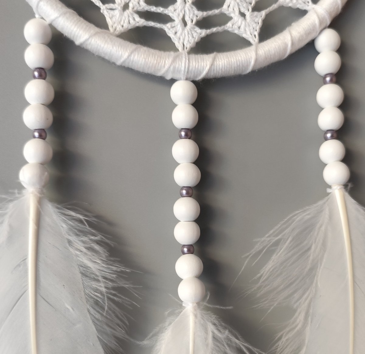 Základní kruh má průměr 15 cm a je omotán bílou 100% bavlnou. Je vyplněn ručně háčkovanou krajkou ze slaboučké 100% bavlny. Na dřevěných a plastových korálcích jsou přichycena tři bílá husí brka.