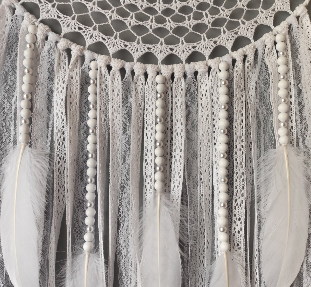 Základní kovový kruh má průměr 40 cm a je vyplněn háčkovanou krajkou z bílé 100% bavlny. Na kruhu jsou zavěšeny bavlněné a silonové krajky a vše doplňují bílá husí peříčka přichycena na dřevěných korálcích a voskových perlách.