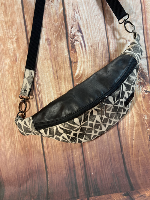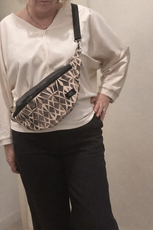 Tuto jsem ušila z potahové černé látky ,vetšíčást je z pevnější džínové látky s autorským motivem který vznikl pomocí linorytu.