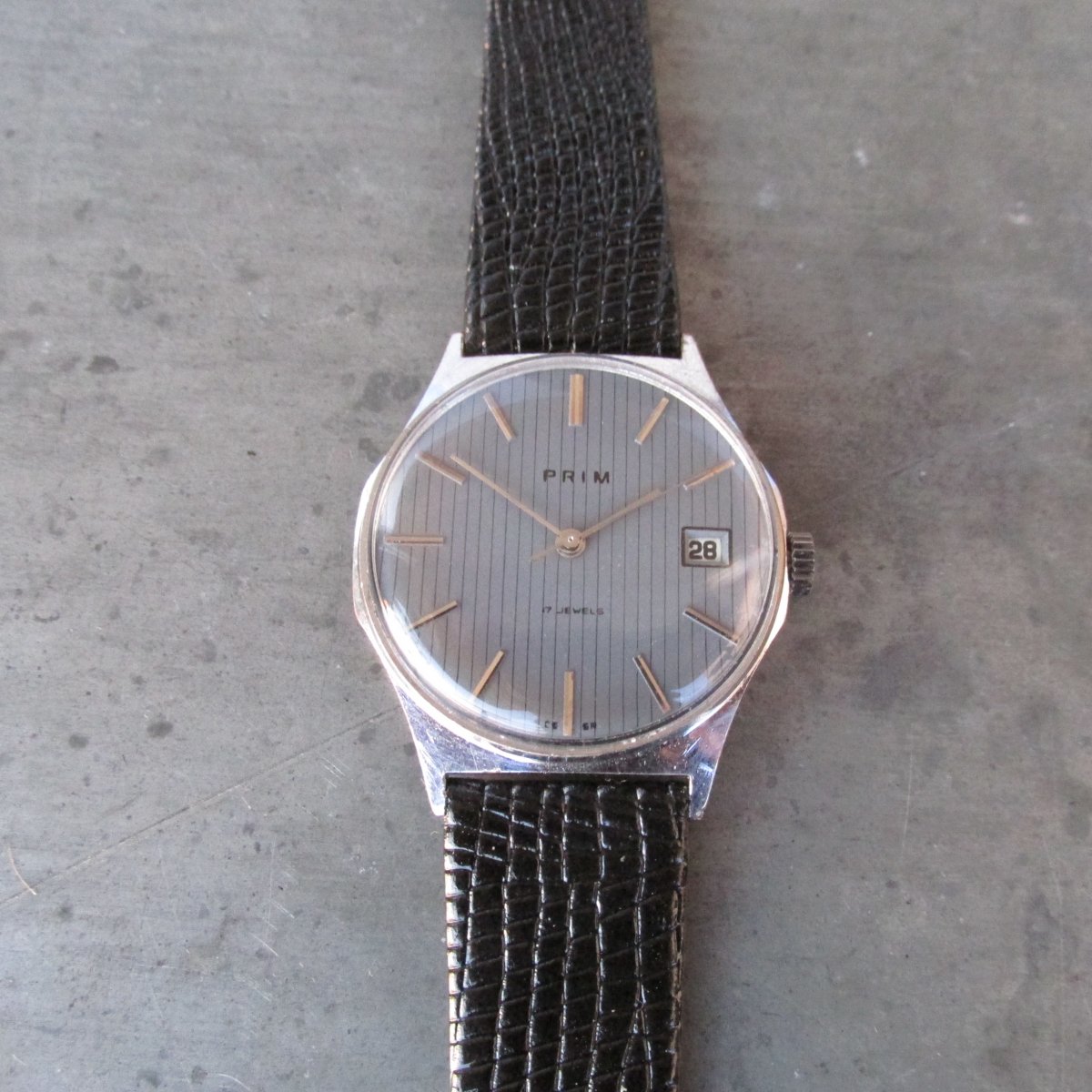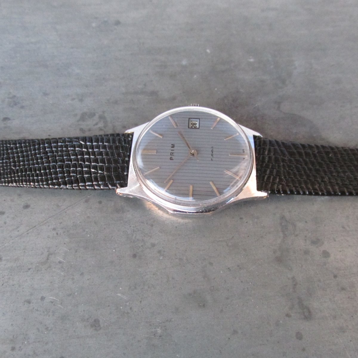 Elegantní mechanické náramkové retro hodinky Prim "PYŽAMO" s datumem, made in Czechoslovakia.