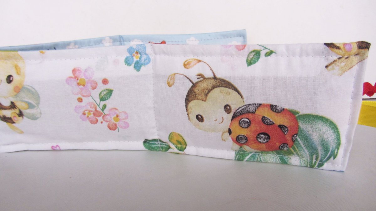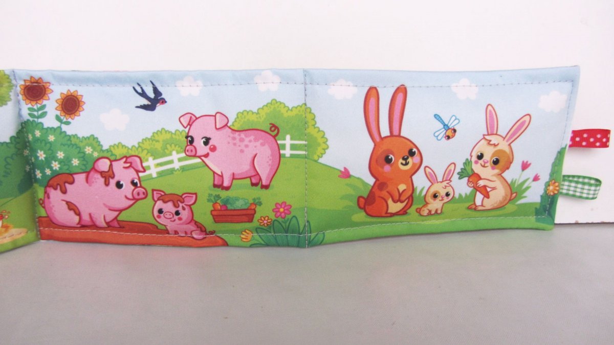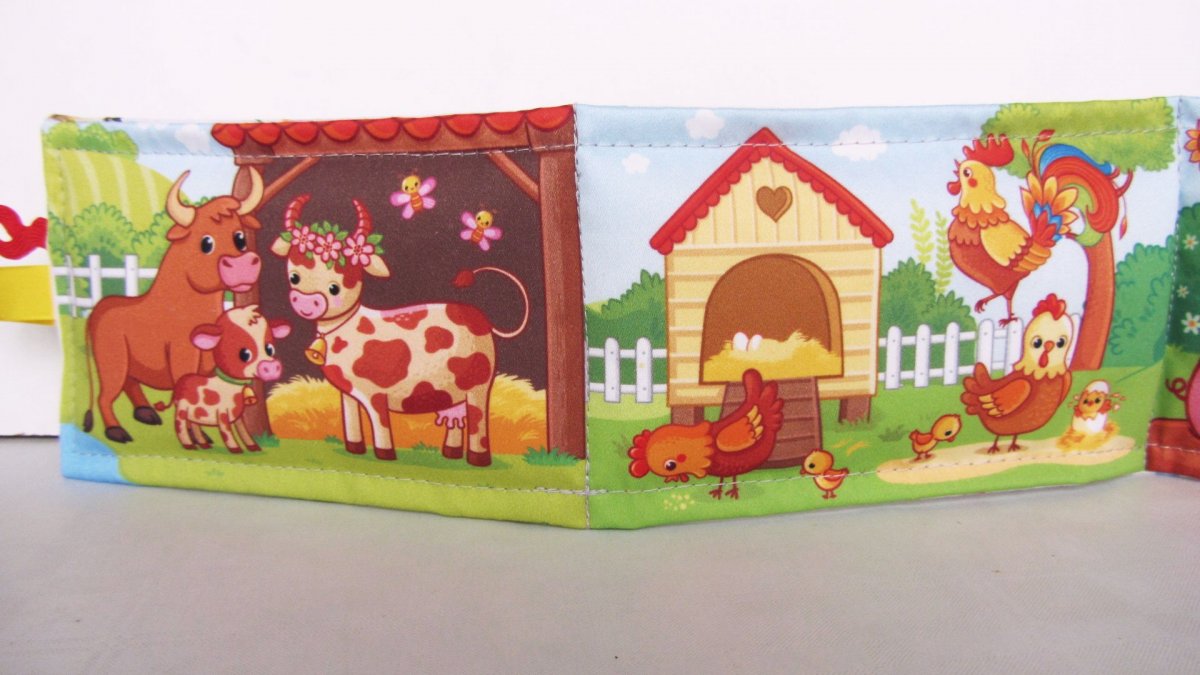 Barevné leporelo se zvířátky na statku, udělá radost vašim dětičkám a zabaví je na chvíle vašeho odpočinku. Leporelo je ušité z bavlněné látky s atestem pro děti do tří let věku dítěte. Přední strana je zpevněna vlizelínem, zadní strana je bavlna s beruškami, leporelo je vyplněno je rounem. Leporelo má všité stužky na kterých si dětičky cvičí jemnou motoriku. Velikost leporela je 60 x 9,5 cm. Leporelo se skládá ze 4 obrázku o velikosti 15 x 9,5 cm.