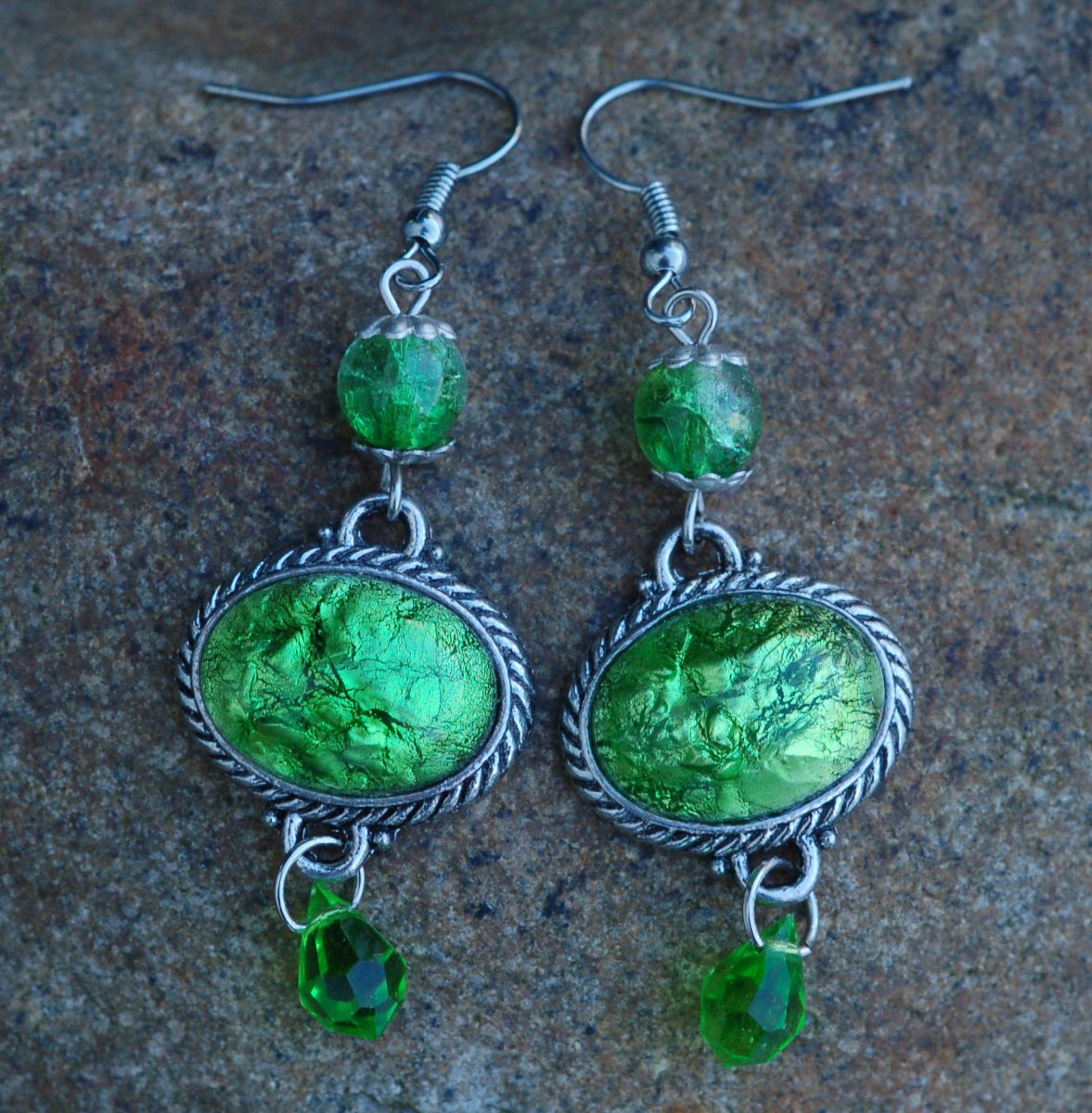 kovové komponenty, ručně mačkaná originální skla od skláře z Jizerských hor 18x13 mm, broušené skleněné kapky, praskačky, délka bez háčků 5 cm.