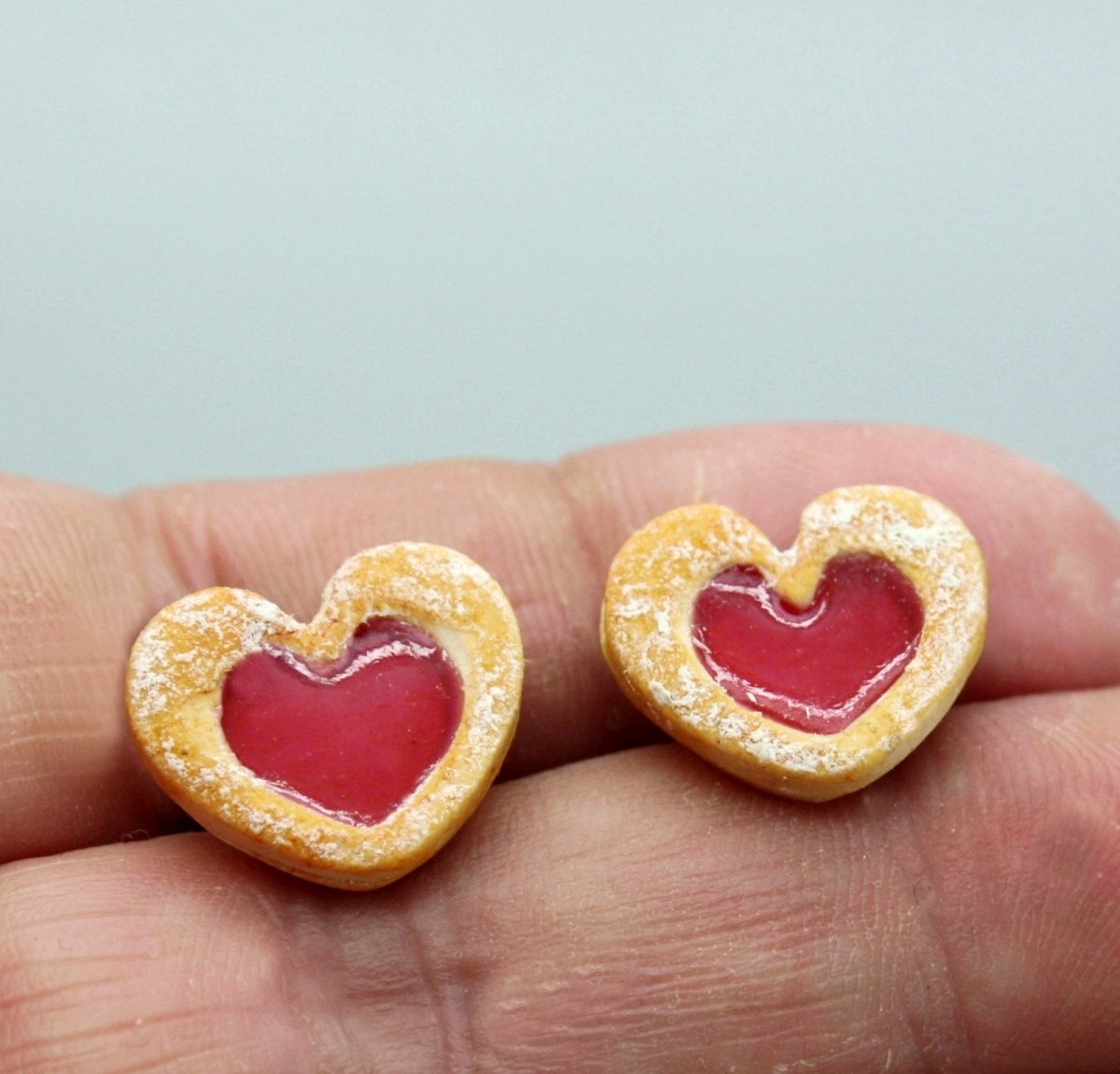 náušnice z polymerové hmoty v podobě lineckého cukroví,  na bižuterních puzetkách,  průměr 1,5 cm