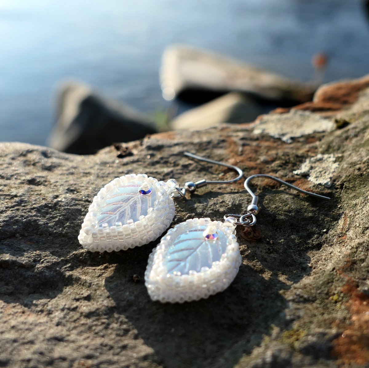 Šité náušnice s mačkaným korálkem s motivem listu - sklo Rutkovsky v barvě bílé s půlpokovem AB (povrchová úprava Crystal AB), obšité japonským rokailem TOHO v barvě bílé a čiré s listrem a AB pokovem. Náušnice jsou doplněny našívacími kamínky Xirius Lochrose Swarovski s pokovem AB. Podšito bílou alcantarou.