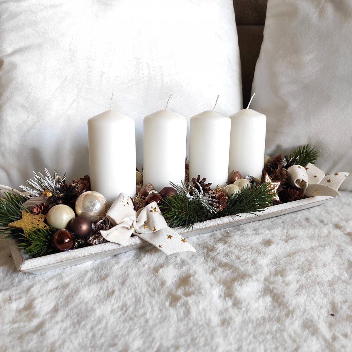 Luxusní adventní svícen na dřevěném patinovaném tácku do bílého ladění. Svícen je zhotoven z různých druhů šišek, ořechů a ze stabilizovaného dovozového mechu. Je ozdoben skleněnými baňkami a dalšími vánočními přízdobami. Kvalitní bílé svíčky jsou součástí dekorace. Věnec je opatřen 4 bodci na svíčky.