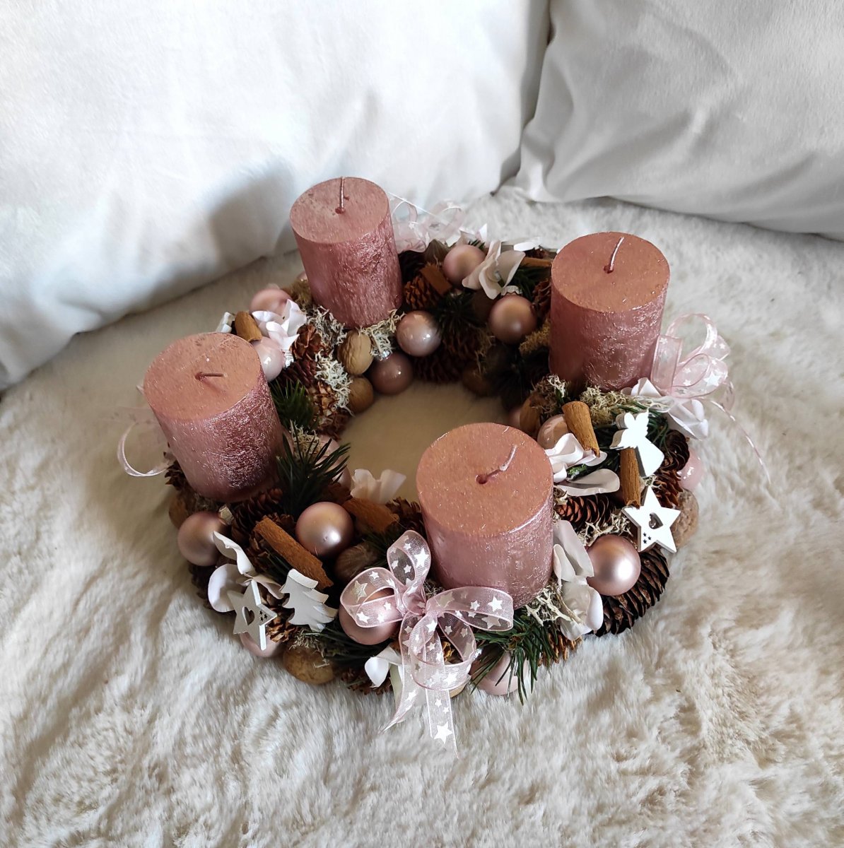 Luxusní adventní věnec do růžového ladění. Je zhotoven z různých druhů šišek, suchých plodů, umělých jehličnatých větviček a ze stabilizovaného dovozového mechu. Je ozdoben skleněnými růžovými baňkami, mašlemi a dřevěnými výřezy. Kvalitní rustikální růžové svíčky jsou součástí dekorace. Věnec je opatřen 4 bodci na svíčky.