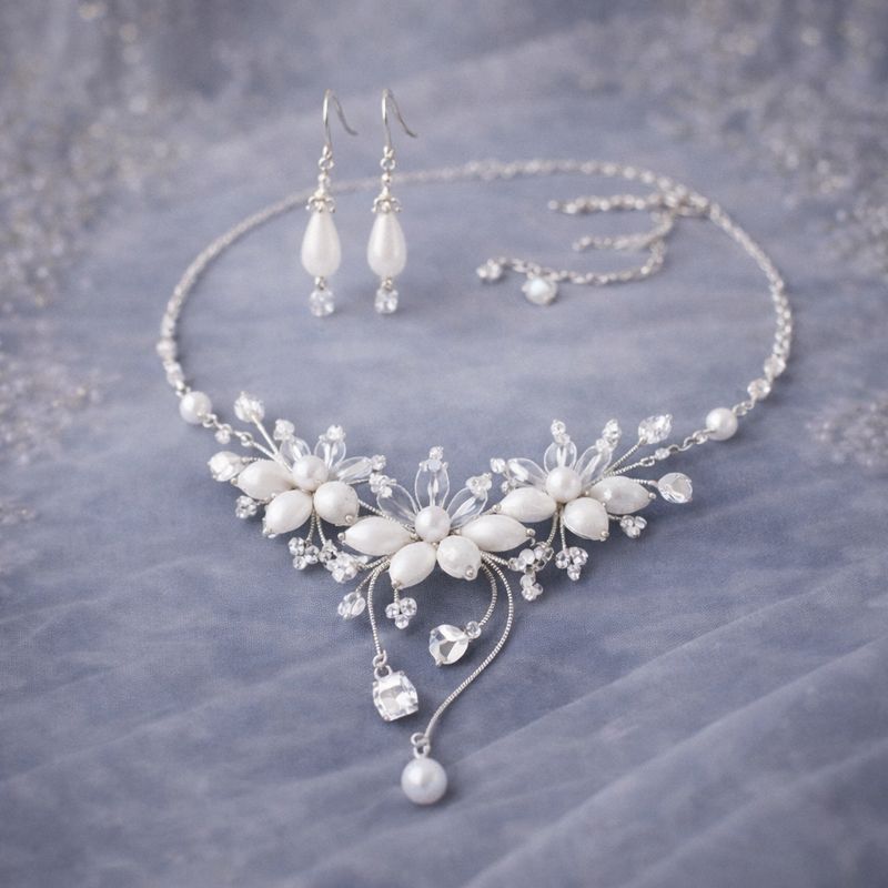 Tento elegantní ručně vyráběný šperkový set v čistě bílé a křišťálově čiré barvě je ideální volbou pro nevěsty i ženy, které hledají jemný, luxusní doplněk ke slavnostnímu outfitu. Náhrdelník zdobený perlami, skleněnými kapkami a jemnými květinovými prvky vytváří nádherný třpytivý efekt, který krásně rozjasní dekolt. Visací náušnice dokonale ladí s náhrdelníkem a podtrhují celkovou eleganci.