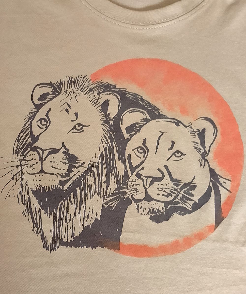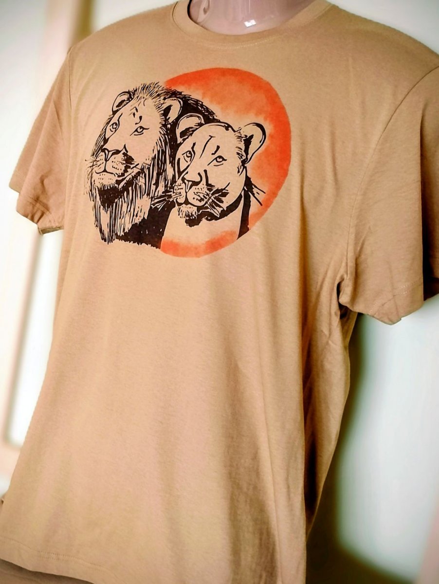 Bavlněné tričko v hřejivých barvách afrického písku s originálním ručním potiskem krále zvířat lva a lvice.