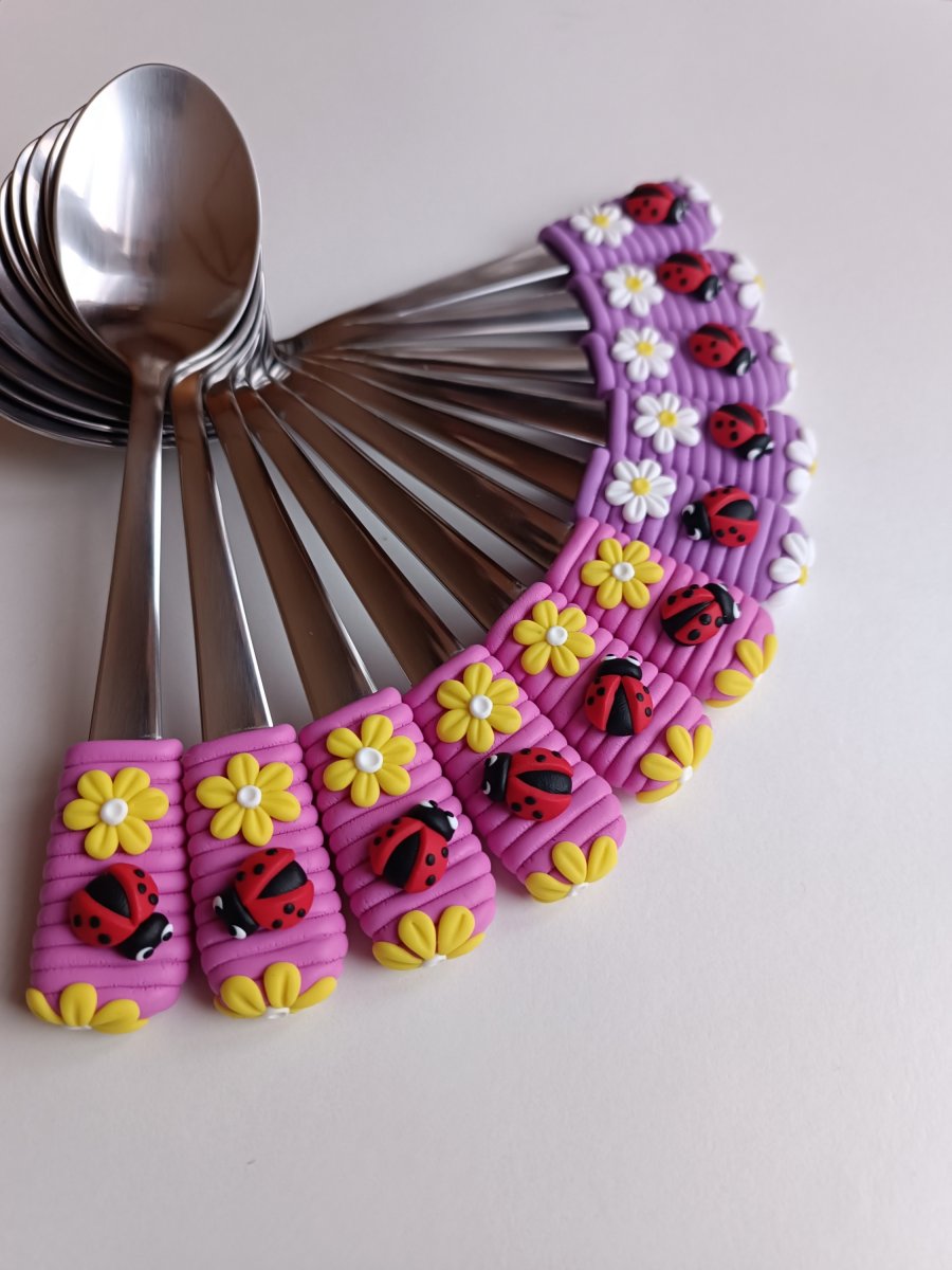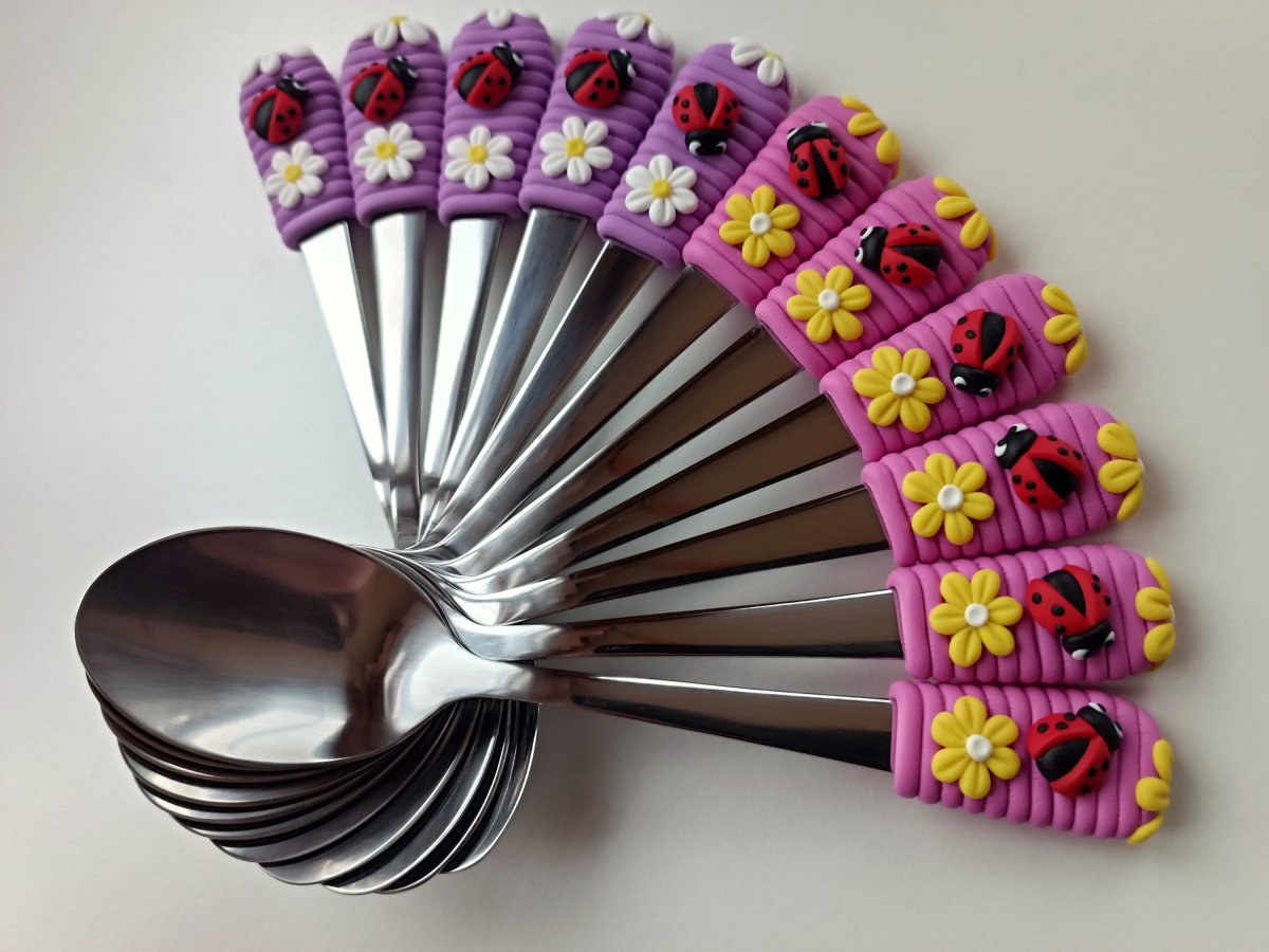 Nerez lžička 13,5 cm ozdobená fimo motivem. Možno vyrobit v jiné barevné kombinaci.