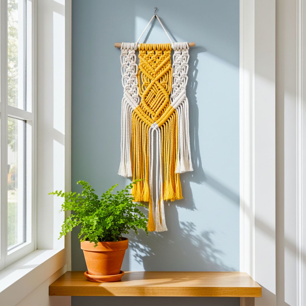 Závěsná dekorace, vyrobená technikou macramé, v Česku známá jako technika drhání, oblíbená v 70 letech opět stoupá na oblibě.