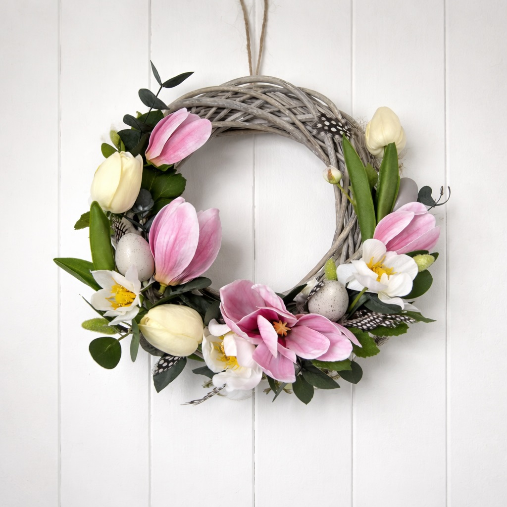 Jarní věnec z proutí ozdobený umělými květinami, vajíčky a peříčky. Velikost věnce 25 cm plus přízdoba.