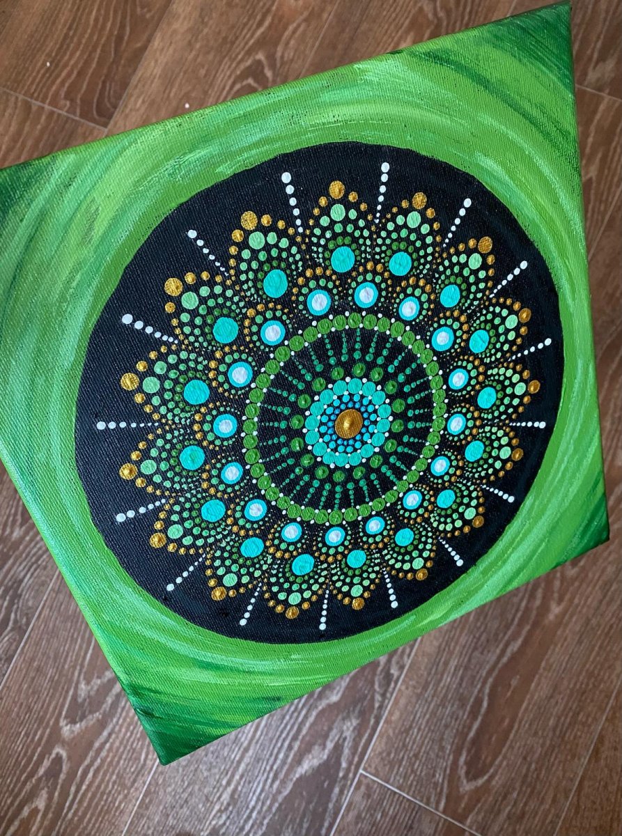 Tato ručně malovaná tečkovaná mandala je zhotovena bez použití šablon. Malovaná kvalitními akrylovými barvami, mezi kterými nechybí ani zlatý odstín.