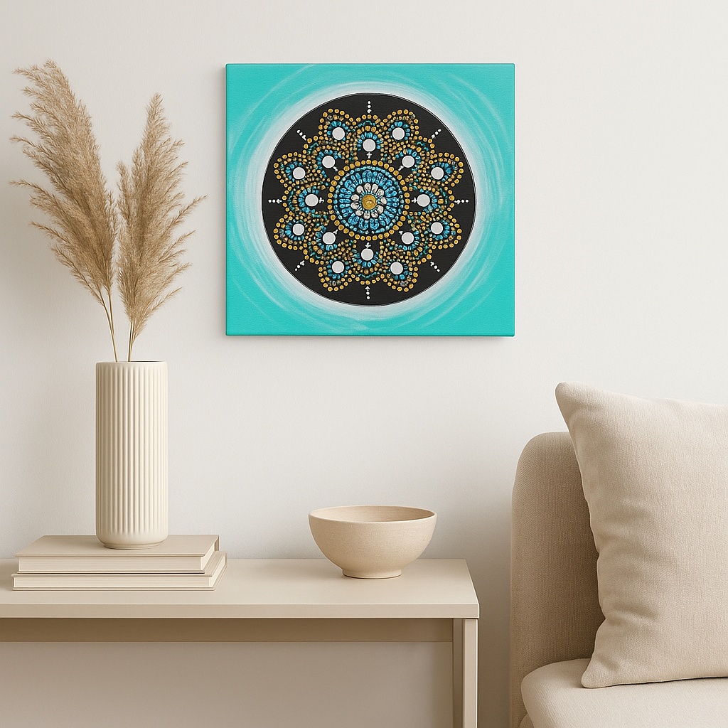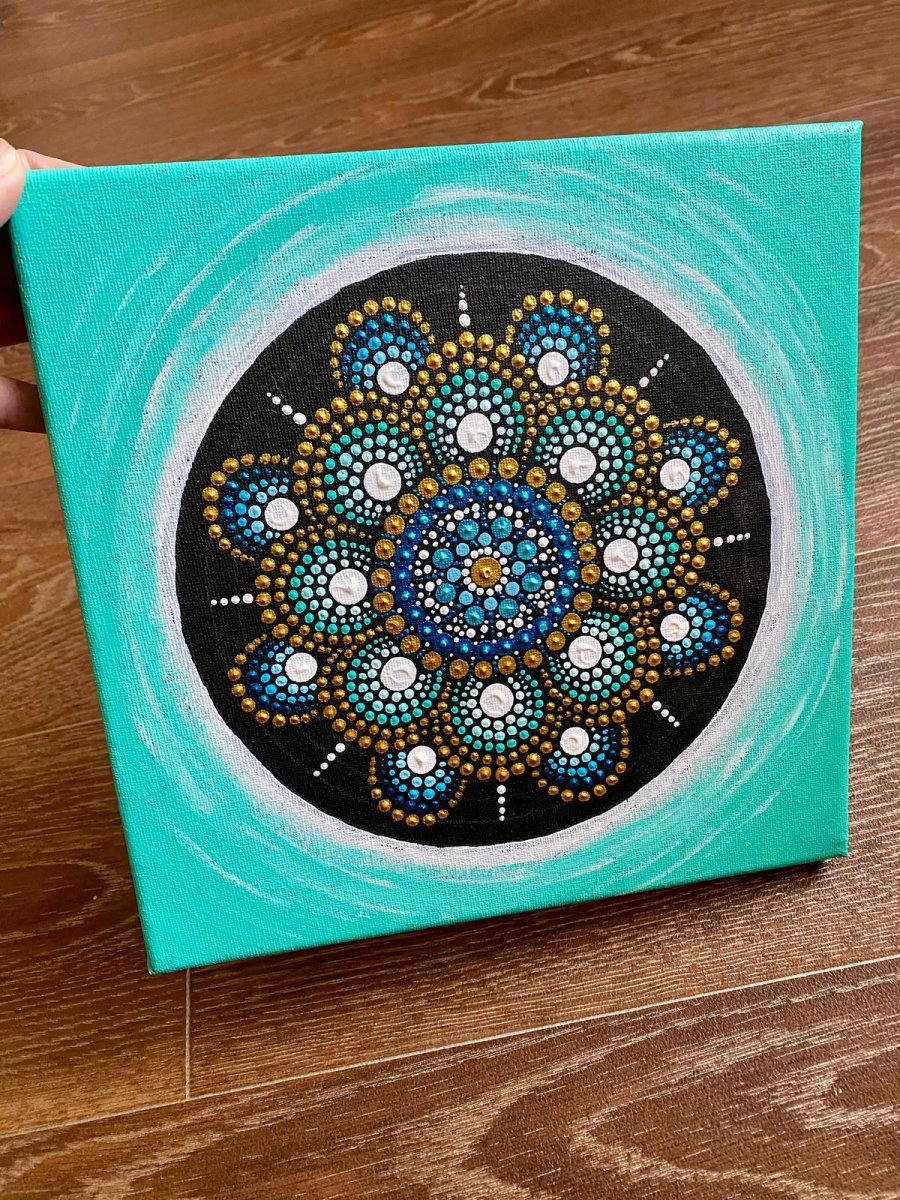 Tato ručně malovaná tečkovaná mandala je zhotovena bez použití šablon. Malovaná kvalitními akrylovými barvami, mezi kterými nechybí ani vzácný zlatý odstín.