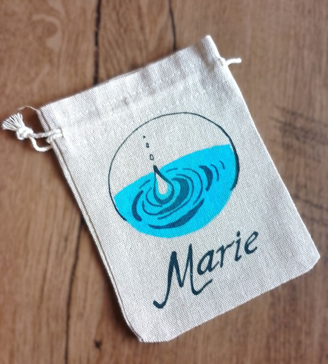 Originální lněný dárkový pytlík s křestním jménem Marie a obrázkem, který symbolizuje jeho význam.