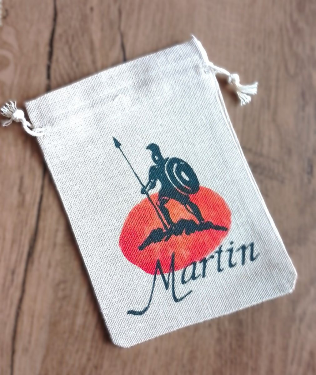Originální lněný dárkový pytlík s křestním jménem Martin a obrázkem, který symbolizuje jeho význam.