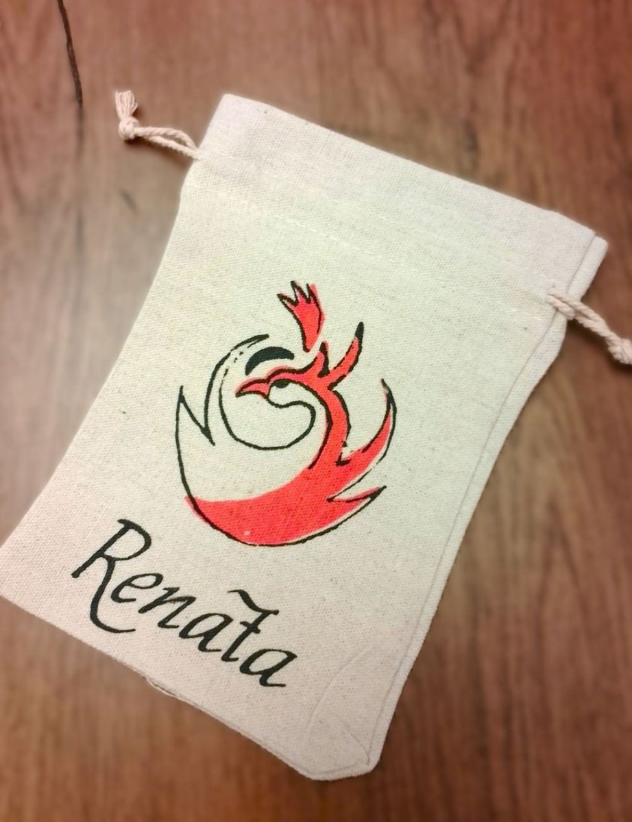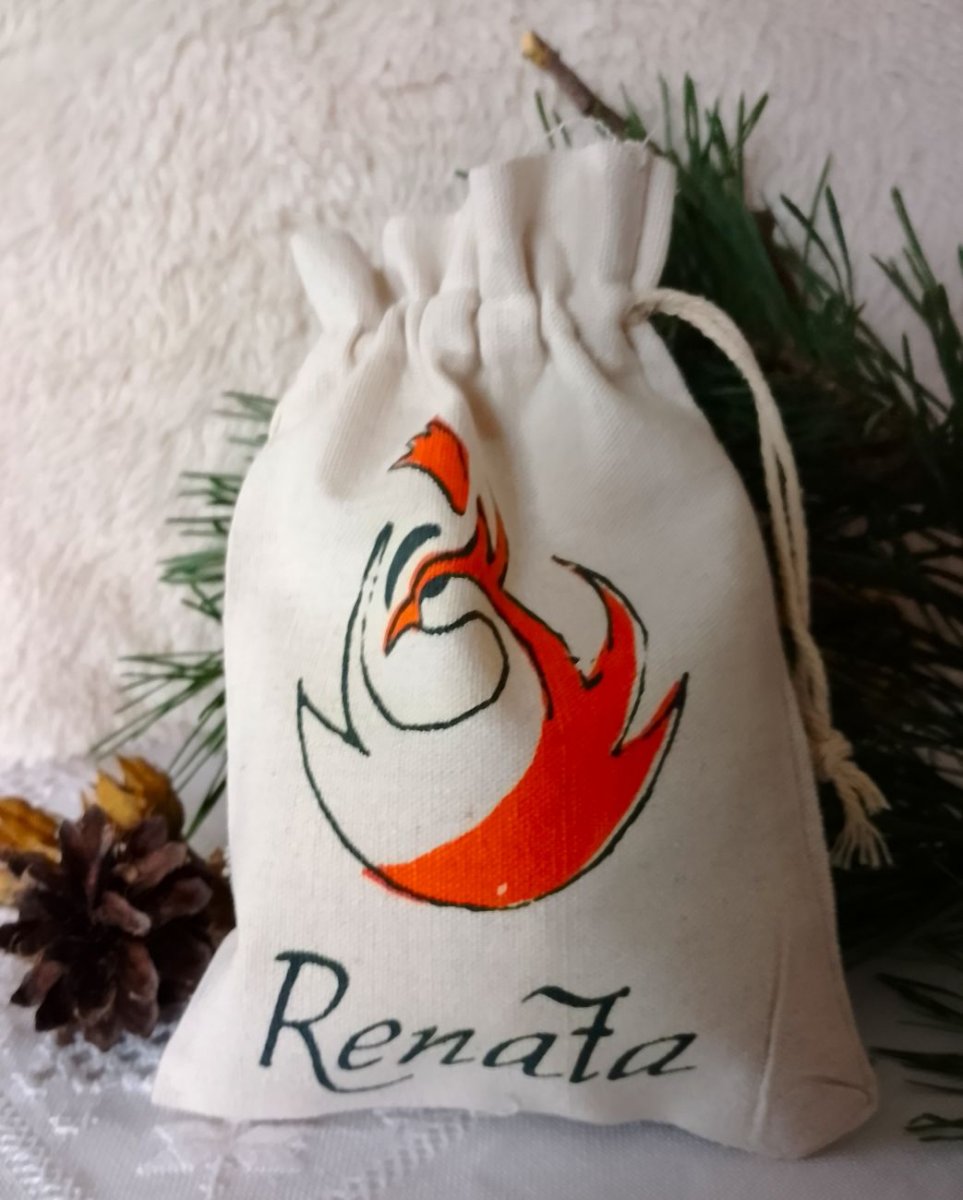 Originální lněný dárkový pytlík s křestním jménem Renata a obrázkem, který symbolizuje jeho význam.