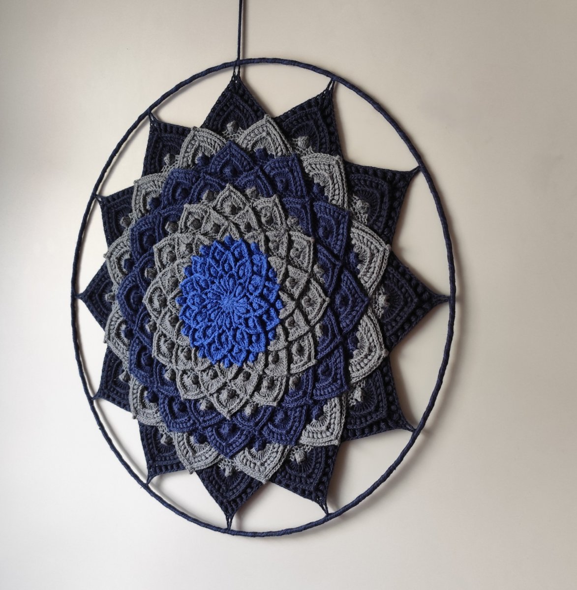 Průměr mandaly je 45 cm, pokud si přejete na mandalu zavěsit krajky a peří a vytvořit tak lapač snů, napište mi určitě se domluvíme.