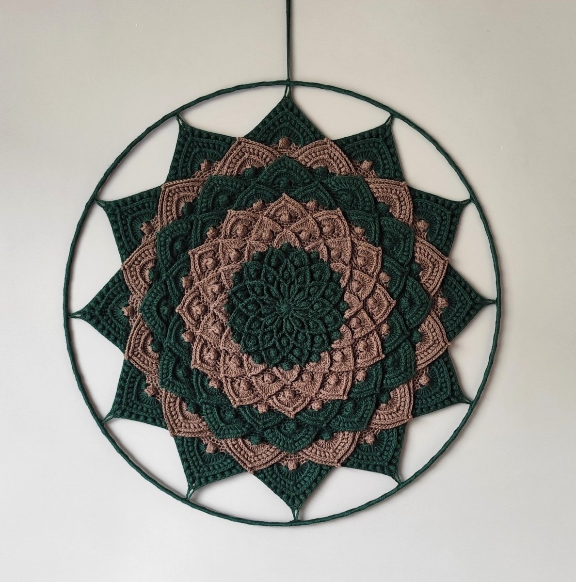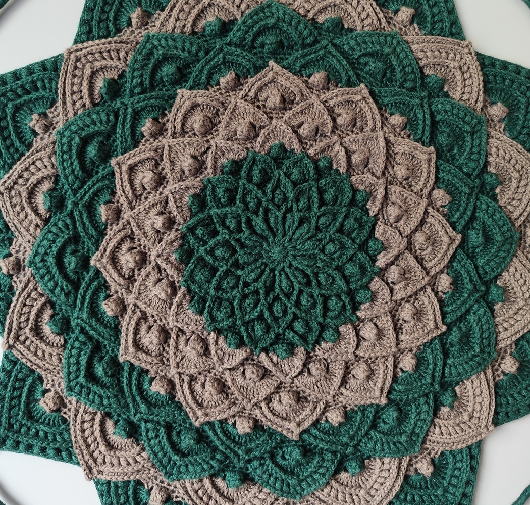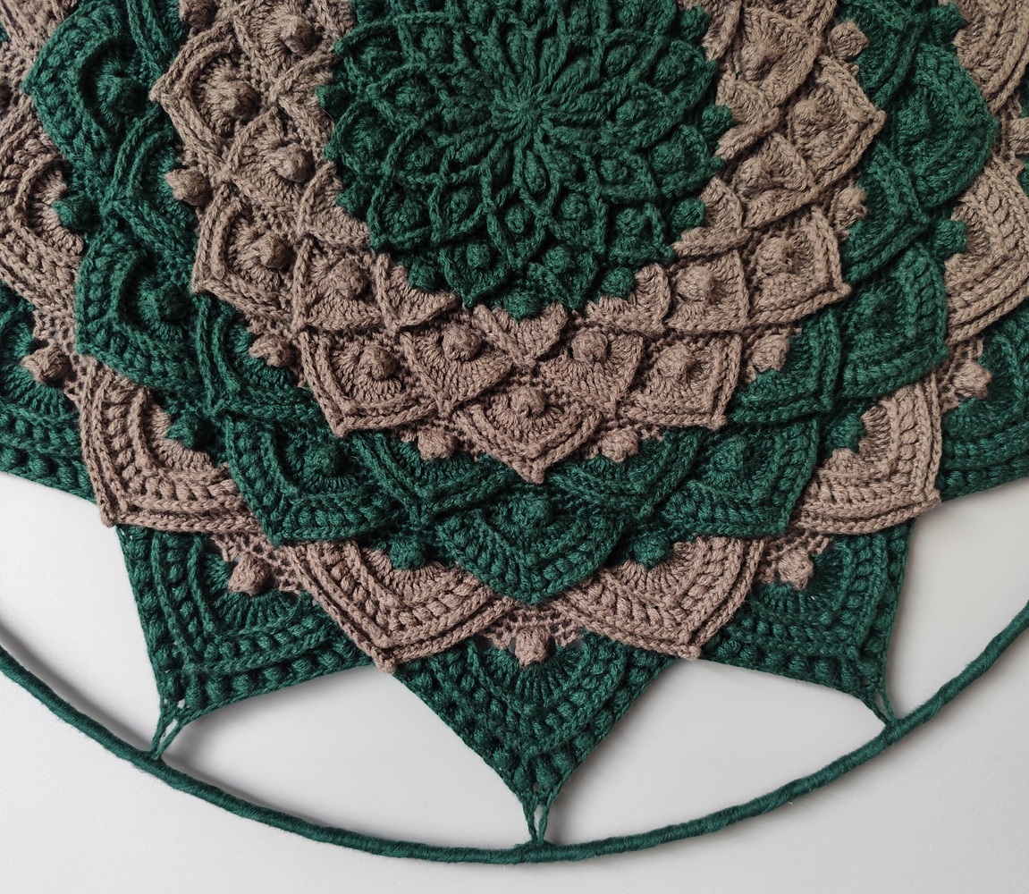 Háčkovaná mandala zeleno hnědá.