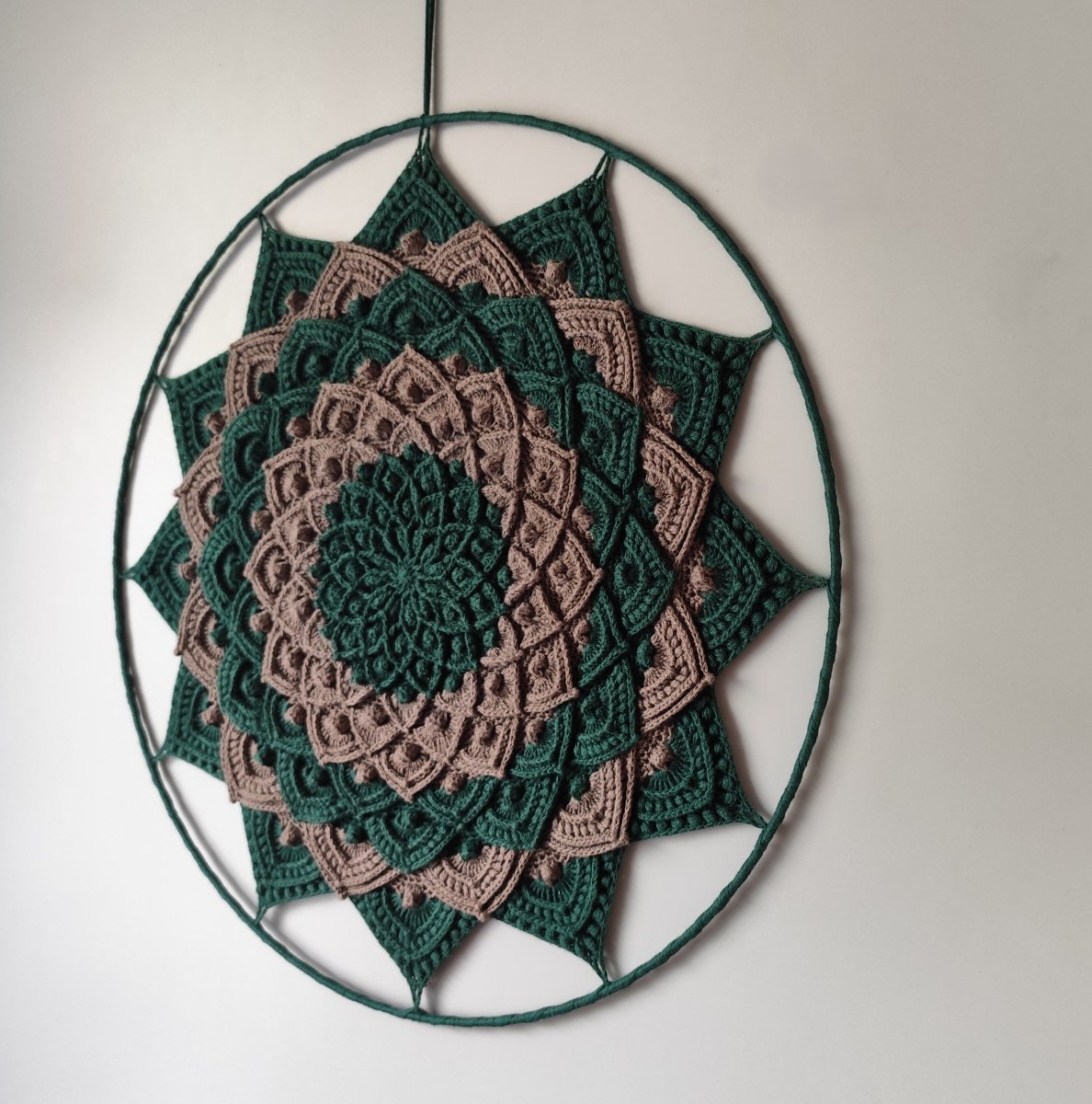 Průměr mandaly je 45 cm, pokud si přejete na mandalu zavěsit krajky a peří a vytvořit tak lapač snů, napište mi určitě se domluvíme.