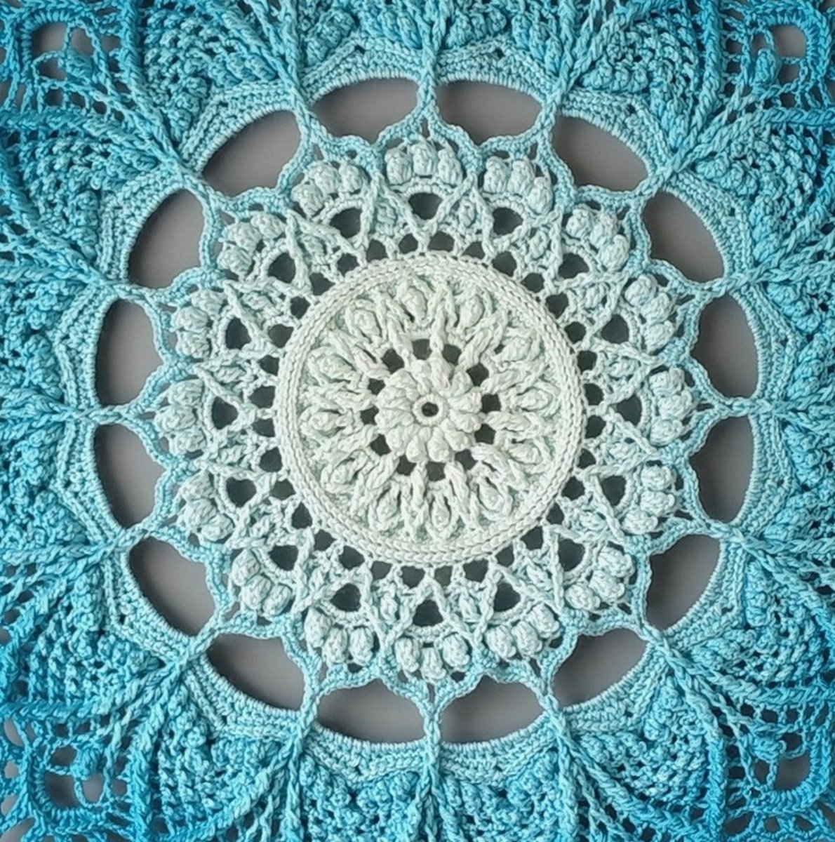 Háčkovaná reliéfní stínovaná mandala v modrých odstínech.