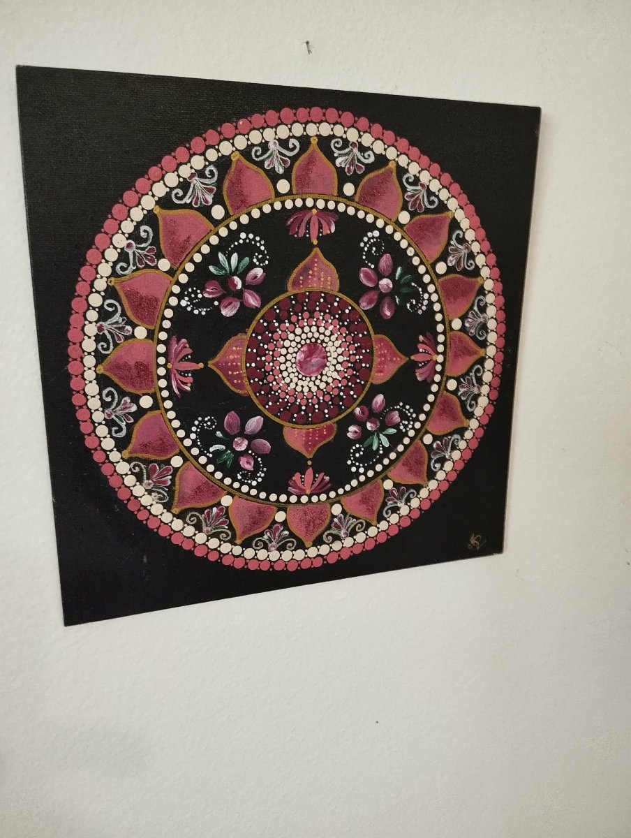Tato mandala má černý podklad, který nechává vyniknout teplé růžové, bordó a krémové tóny, doplněné zlatými konturami a jemnými zelenými akcenty. Uprostřed je soustředný kruh z teček, který přechází z tmavě bordó přes růžovou do krémové jako jádro rozkvétajícího květu. Okolo něj jsou čtyři větší růžové okvětní lístky s jemným stínováním, mezi nimi menší květinové motivy s pěti okvětními lístky . Vnější prstenec tvoří řada větších růžových lístků se zlatým lemem, střídající se s drobnými ornamenty. Celý kruh uzavírá dvojitý okraj z teček (krémová a růžová). Působí jemně, žensky a vyrovnaně, s důrazem na symetrii a detail. Celkově z ní cít klid, láskyplnost a tichou radost.