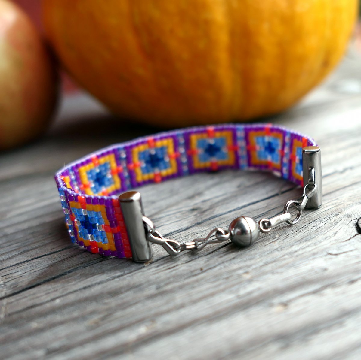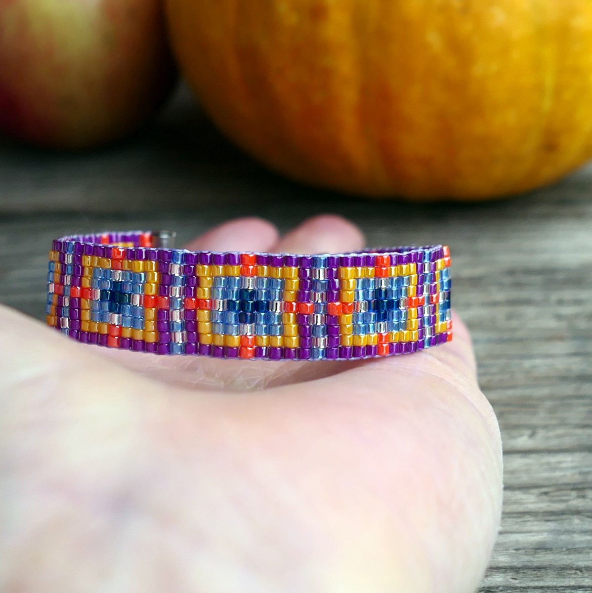 Ručně tkaný náramek z luxusního japonského Miyuki rokailu - světle modrá, modrá, fialová, žlutá a oranžová, pravidelný vzor.