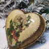 Dekorace srdíčko s motivem děvčátka v zimním kabátku a kočičky. Hlavní obrázky jsou krakelované a opatřené lesklým lakem. Okolo obrázku je květinová bordura a celé srdíčko je laděné do zlaté barvy. Je vhodné k zavěšení nebo k dekoraci, také může být použité jako vánoční ozdoba na stromeček.