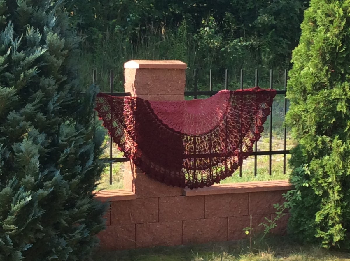 háčkovaný hřejivý šátek z barveného buretového hedvábí . Půlkruhový s motivem květů v růžové a bordó kombinaci. Výška 83 Cm délka 174