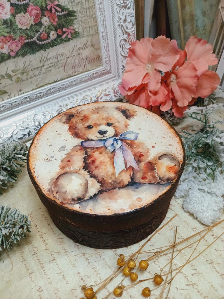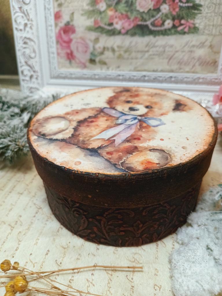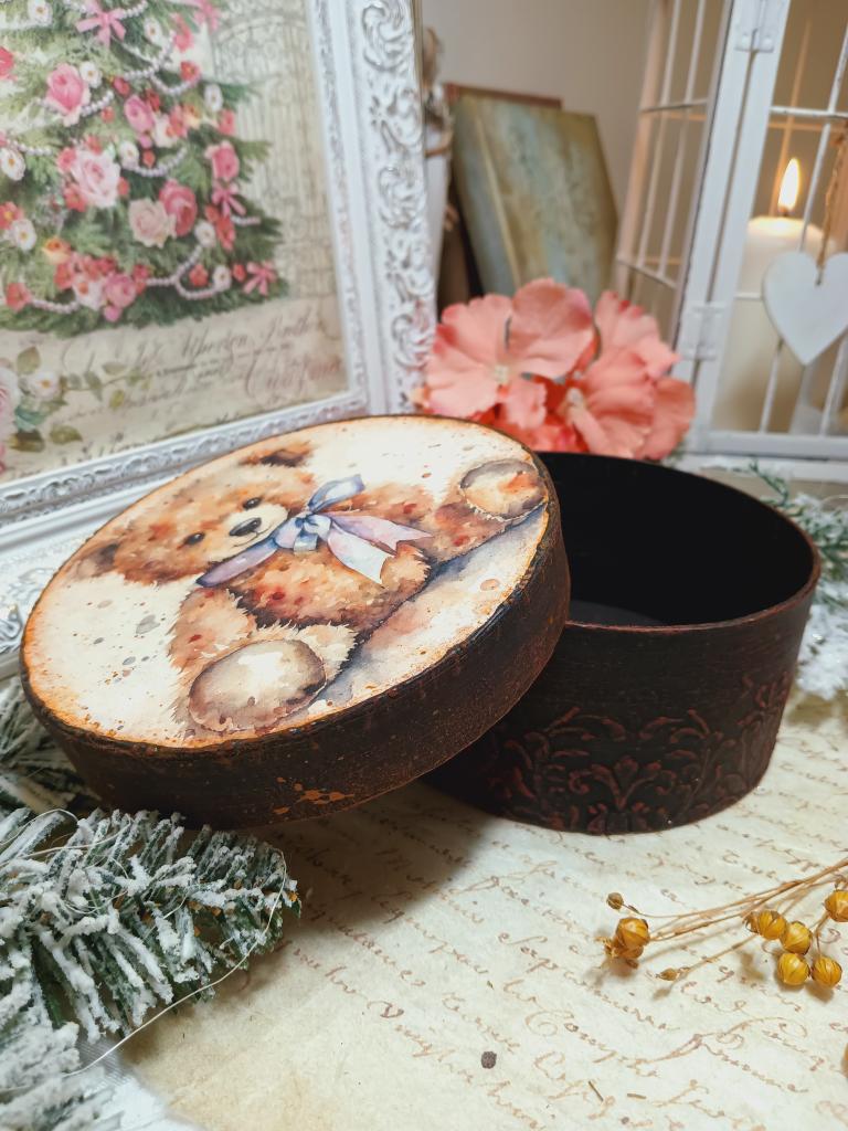 Kulatá krabička z tvrdého kartonu s motivem plyšového medvídka. Krabička je bohatě zdobená šablonovanými vzory a patinovaná.