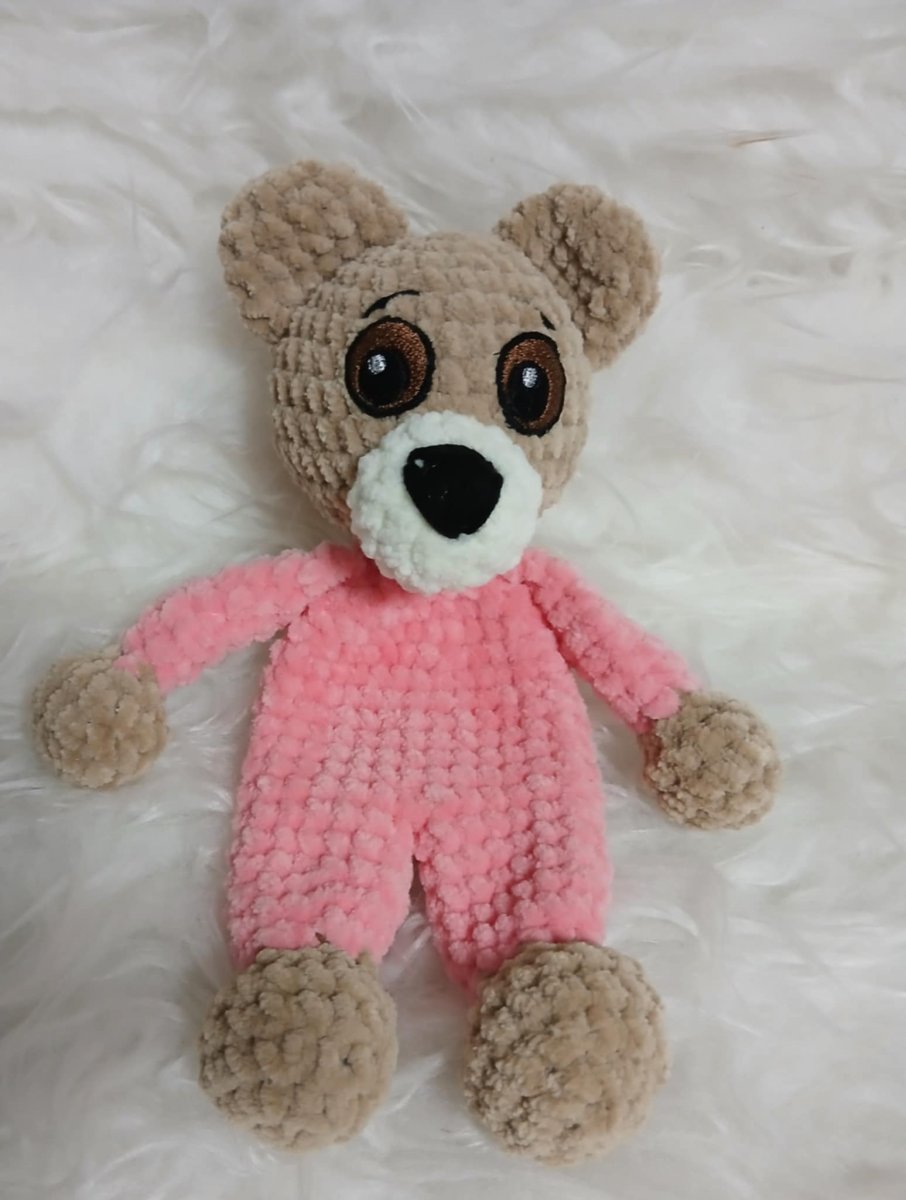 Háčkováno z příze100% polyester a kombinace bavlna a polyester je na hlavičce a ouškách, vyšívaná očička