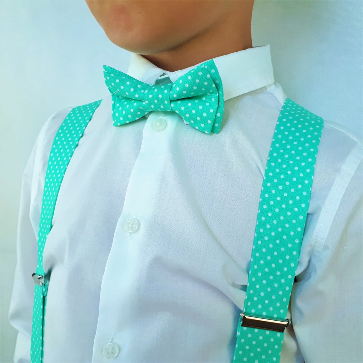 Elegantný pánsky motýlik, traky a vreckovka do saka v mentolovej farbe s bielymi bodkami. Bol vyrobený pre tých, ktorí sa neboja priniesť nové farby do svojho štýlu.
