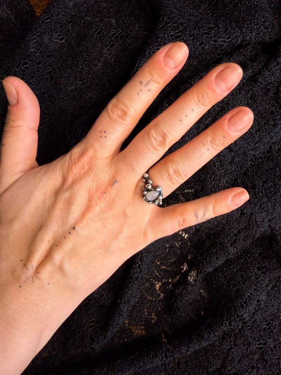 Jemný prstýnek s MĚSÍČNÍM KAMENEM se spoustou cínových detilů a kuliček.