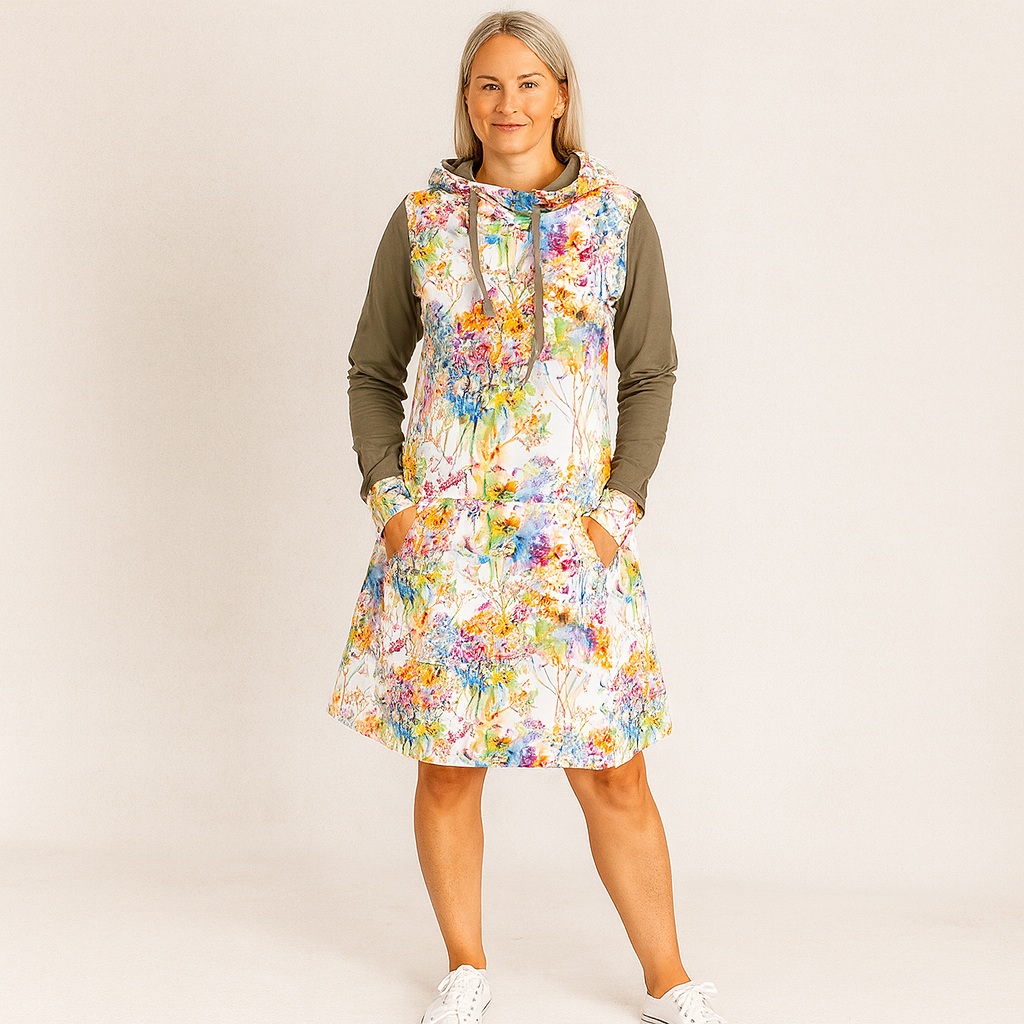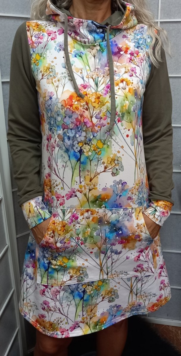 Pohodlný střih, v pase mírně projmutý, na předním díle našitá klokaní kapsa, vypodšívkovaná kapuce se šnůrkou. PD i ZD do kulata.