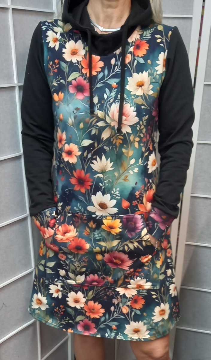 Mikinové šaty jsou ušité z příjemné teplákoviny 95% bavlna, 5% elastan.