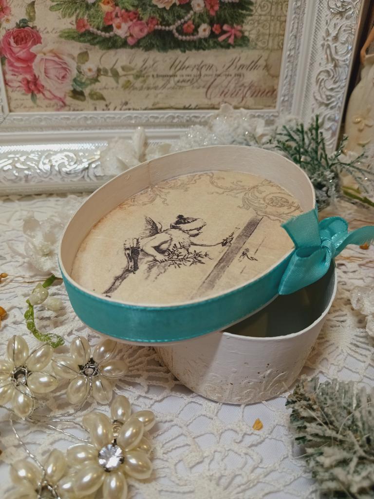 Oválná dřevěná krabička s motivem ženy, která jde ve sněhu a nese v košících chvojí, okolo ní jdou zvířátka. Kolem obrázku jsou filigrány a víko krabičky je ozdobené tyrkysovou stužkou. Vnitřní část víka je ozdobená andělíčkem. Spodní díl je reliéfně šablonovaný bordurou a lehce patinovaný.