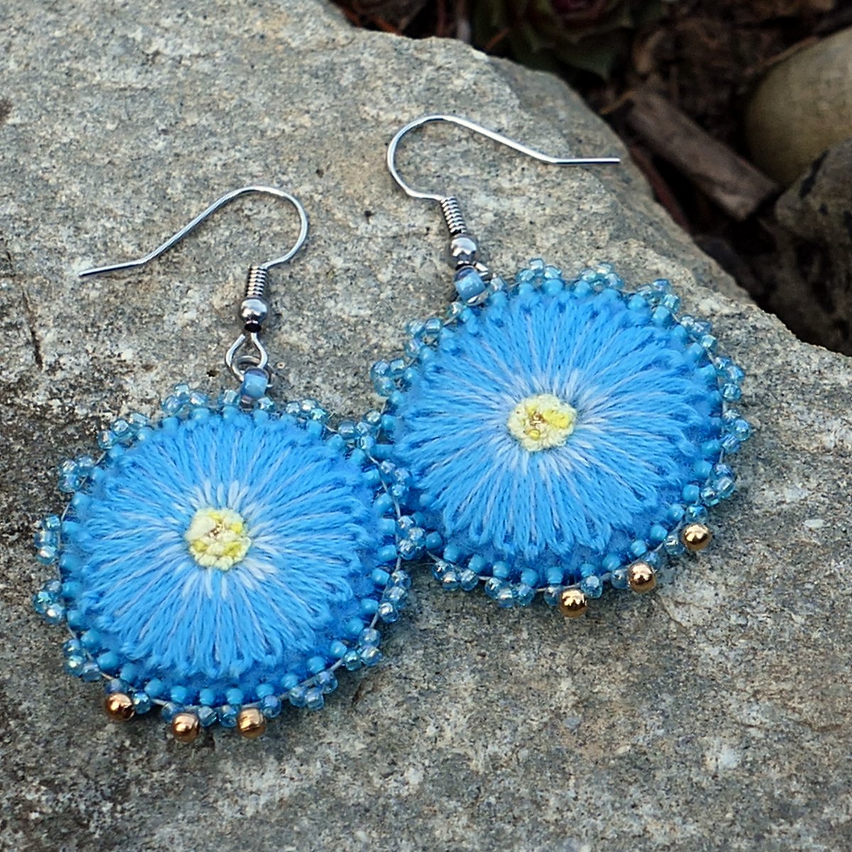 Ručně vyšívané náušničky průměru 3 cm, kvalitní vyšívací příze, otevřené háčky nerez. Včetně silikonových zarážek. Výšivka na filcu. Náušnice jsou lehounké. Uprostřed očka zlatá nitka.