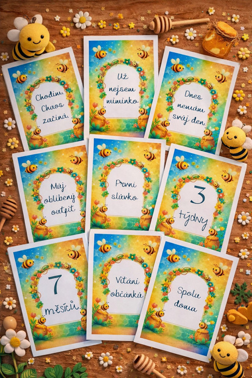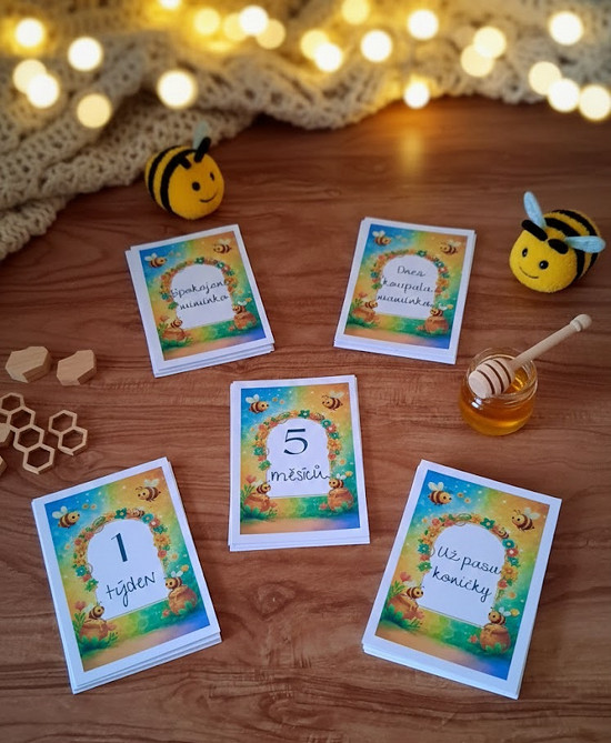 Roztomilá sada milníkových kartiček s motivem včelek pro zachycení těch nejkrásnějších okamžiků prvního roku života vašeho miminka.