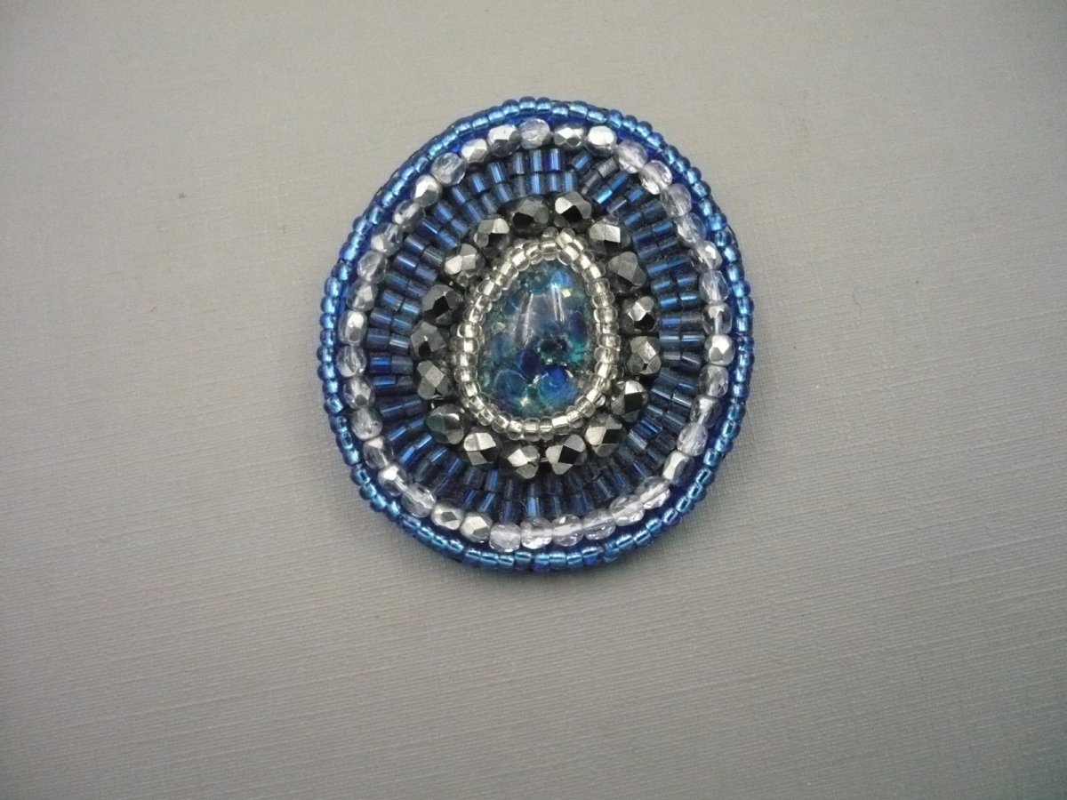 Ručně vyšívaná brož technikou beadweaving. Uprostřed brožky je skleěný kabošon obšitý rokajlem a stříbrnými ohňovkami, vše je podloženo modrou plstí, na zadní straně je brožový špendlík s pojistkou. Rozměry 48 x 43 mm.