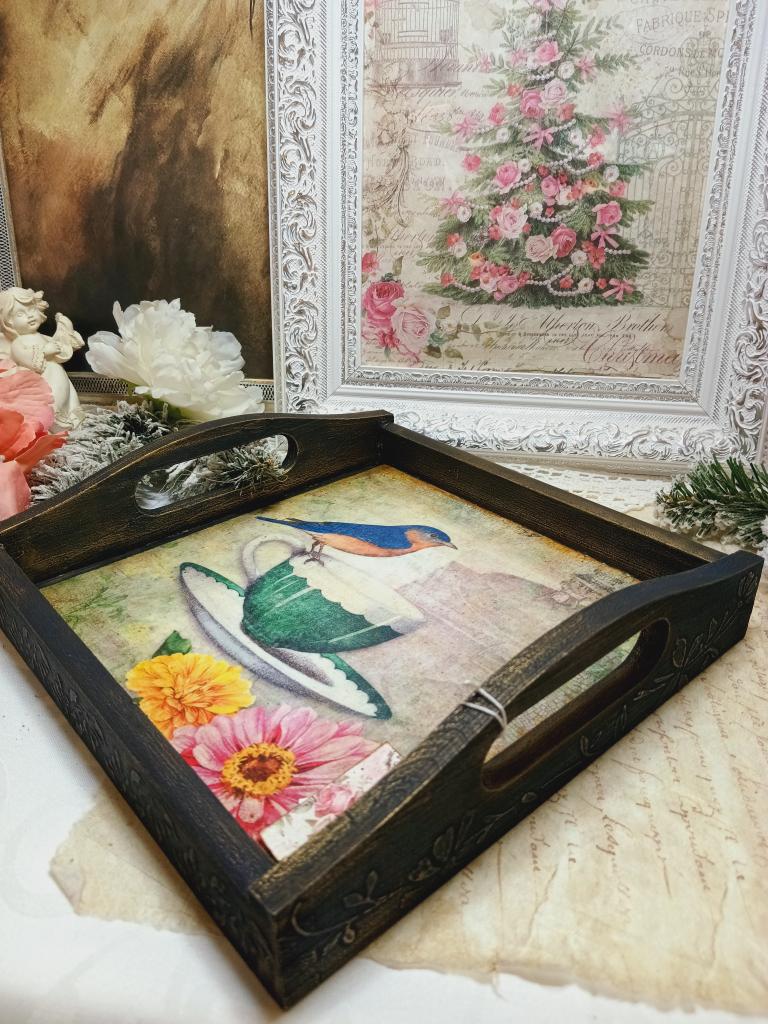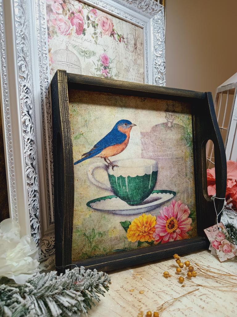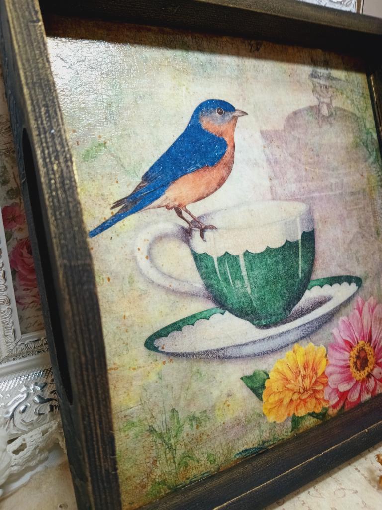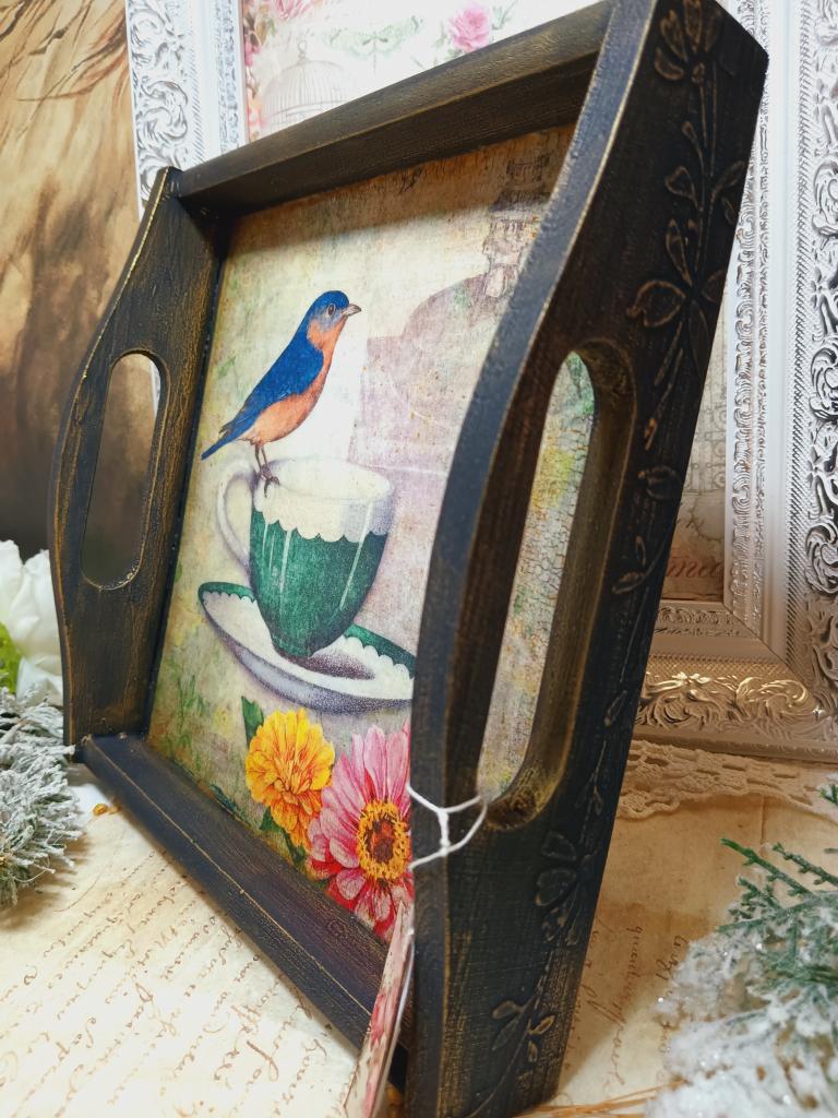 Dřevěný podnos dekorovaný motivem modrého ptáčka sedícího na šálku a květinami. Podnos je reliéfně zdobený šablonováním, bordurou a nápisy a poté patinovaný zlatavými vosky. Hlavní motiv je krakelovaný a opatřený lesklým lakem.