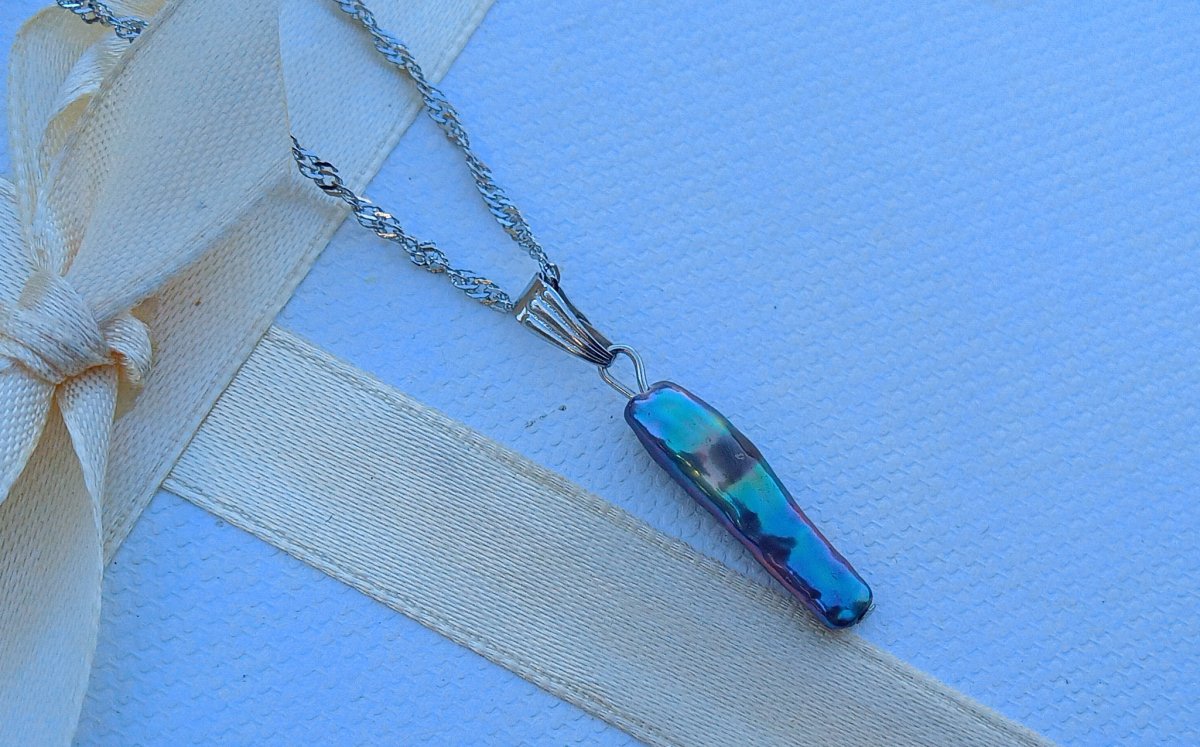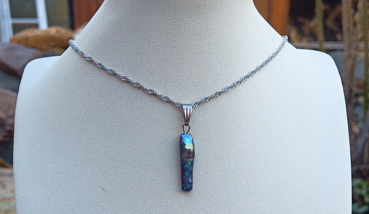 Netradiční, dlouhá, dokonale lesklá tmavá mořská keshi perla 22 mm s nádherně duhovými perleťovými odlesky elegantní přívěsek na spirálovém řetízku z chirurgické oceli - hypoalergenní = vhodné i pro alergiky. Perla je v top kvalitě!