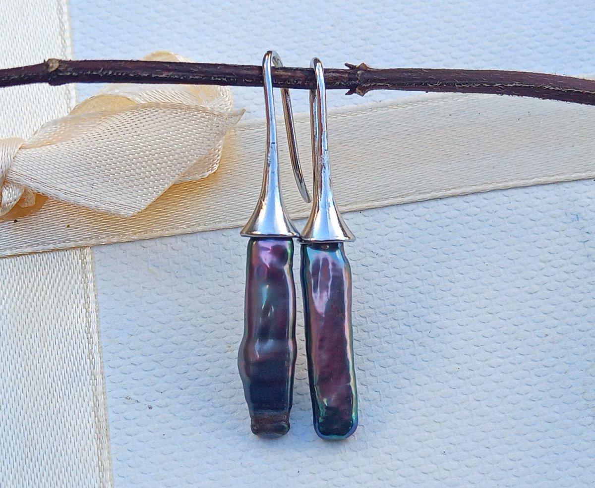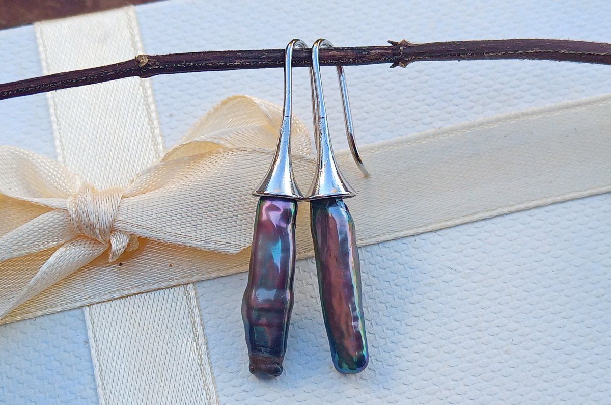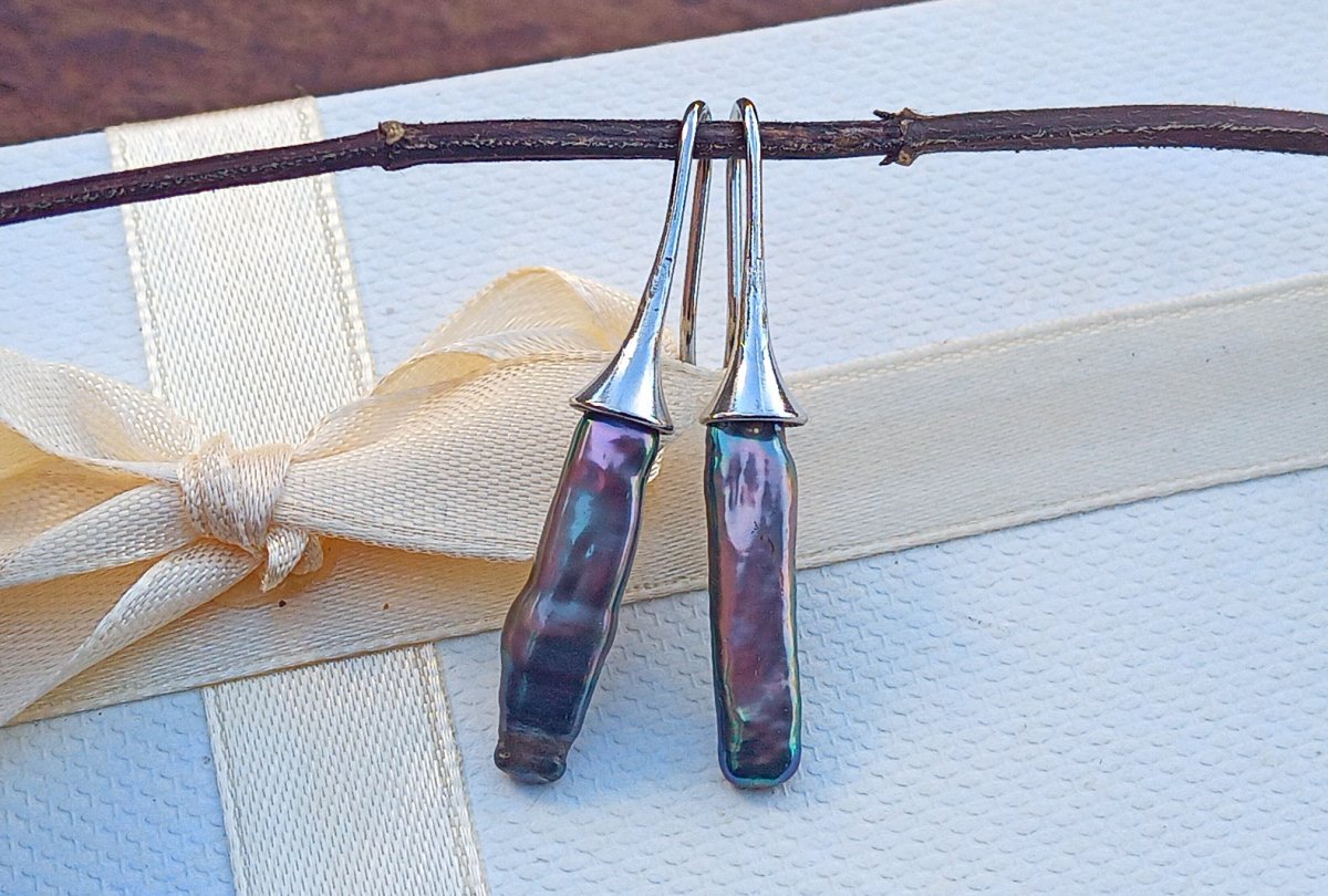 Netradiční, dlouhé, dokonale lesklé tmavé mořské keshi perly 22 mm s nádherně duhovými perleťovými odlesky na elegantních háčcích z chirurgické oceli - hypoalergenní = vhodné i pro alergiky. Perly jsou v top kvalitě!