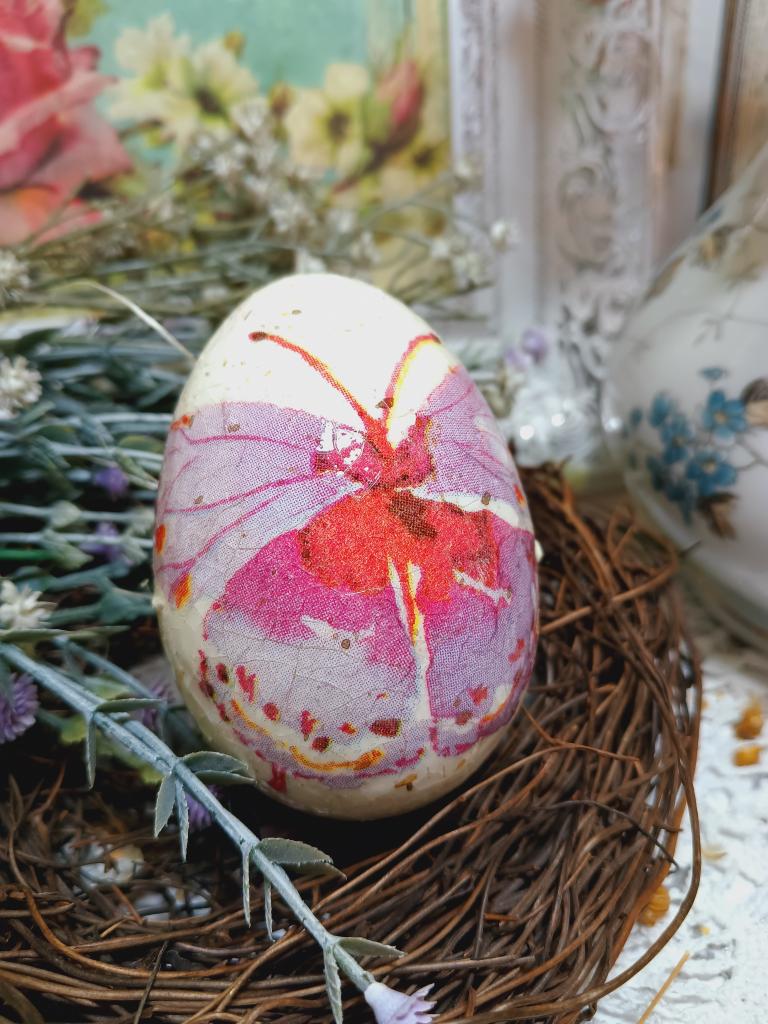 Velikonoční dekorace vajíčko s motivem motýlků v růžové a fialkové barvě. Vajíčko je a celé je krakelované a opatřené lesklým lakem. Vajíčko je tvořené jako zápich (na špejli) do dekorce, věnce, květin, květináče.