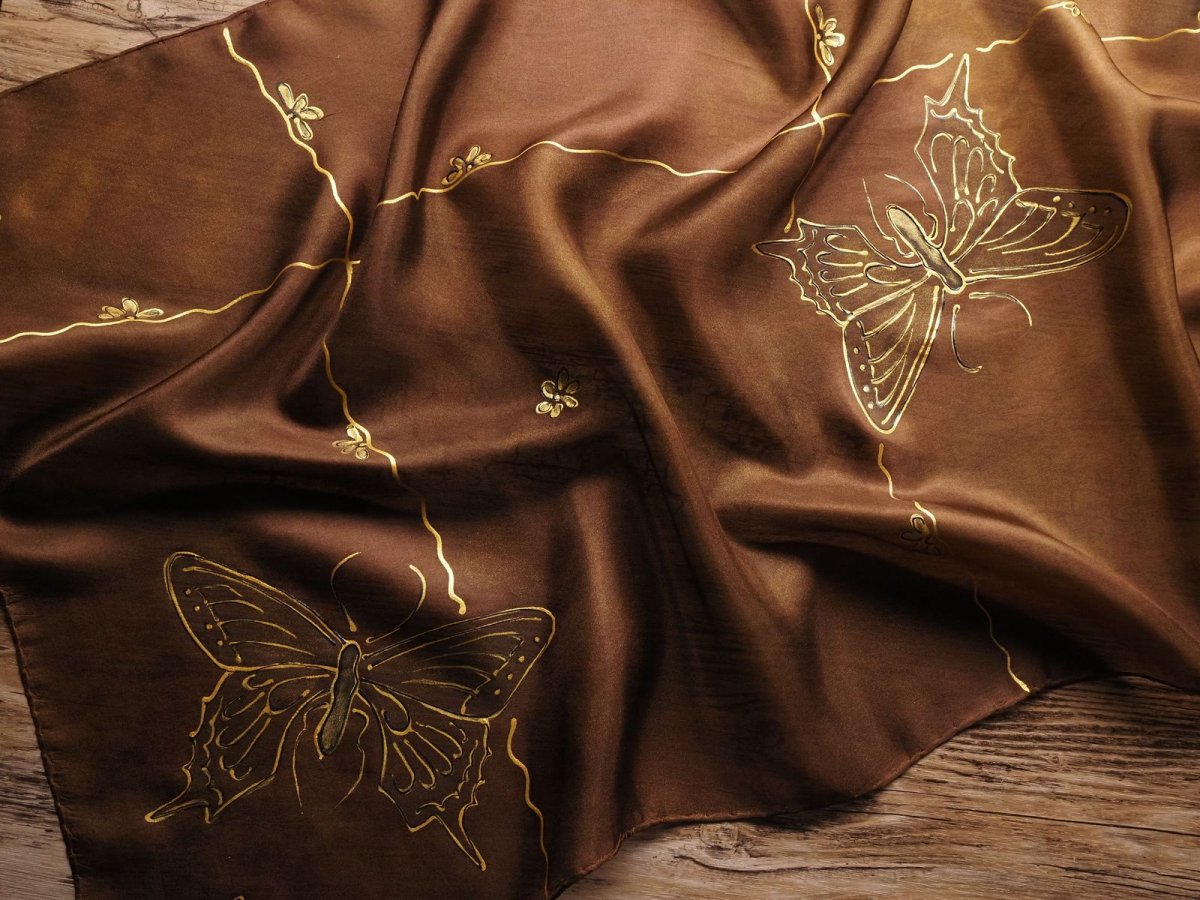 Ručně malovaný šál z přírodního hedvábí (pongé 5). Použití kvalitních barev a tepelné fixace zaručuje dlouhodobou odolnost při opakovaném praní. Snadno se žehlí. Podklad je jemně batikovaný s přidáním zlatých třpytek.