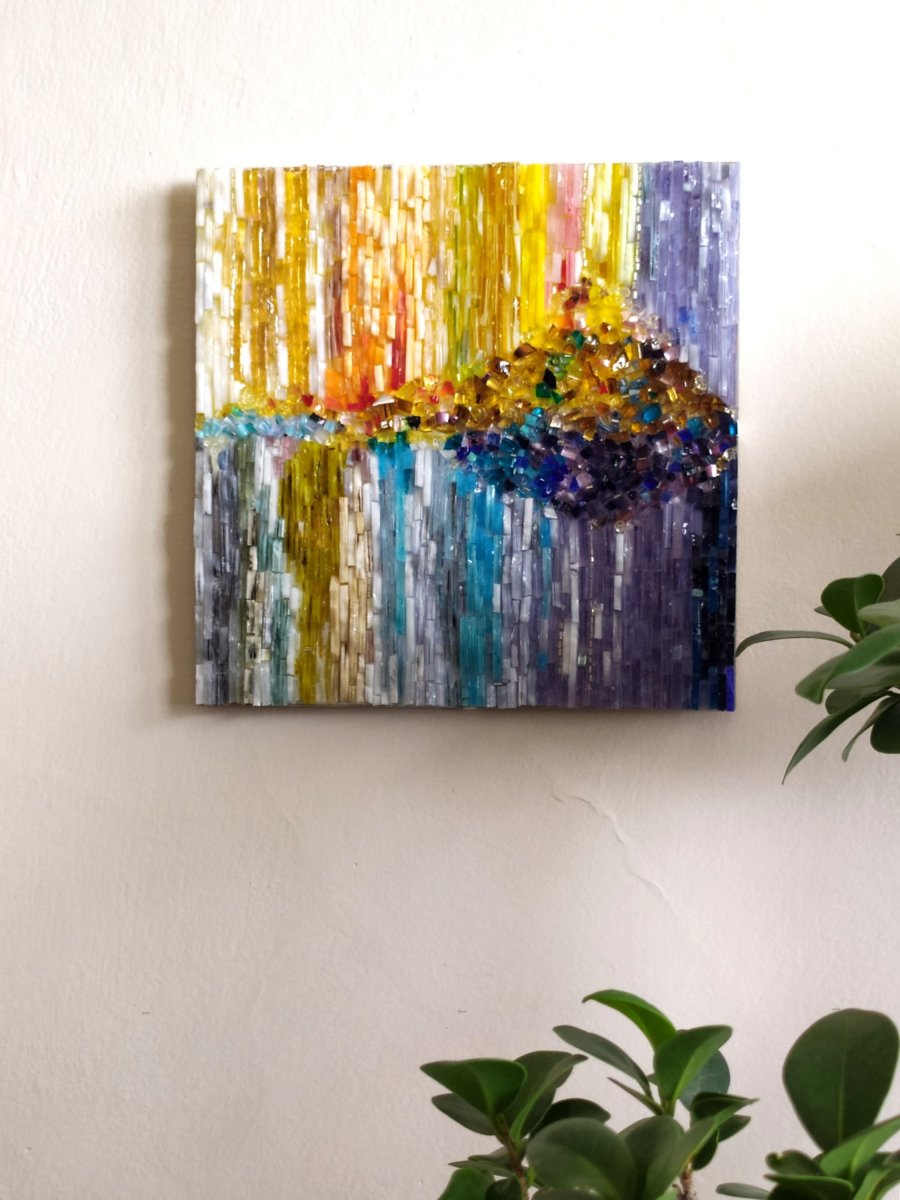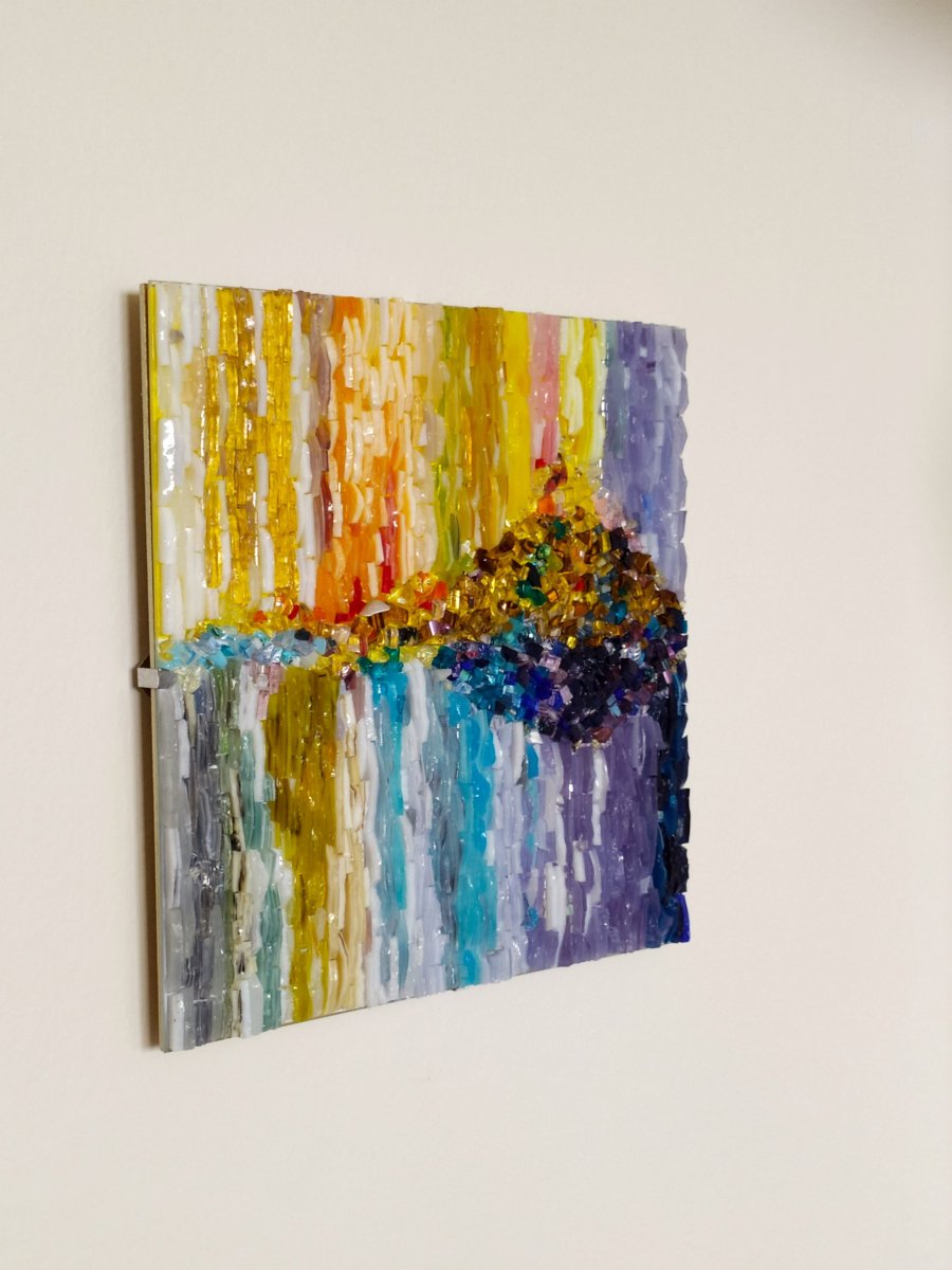 Tvořeno ze škály barevného ručně štípaného skla. Štípané kousky skla odráží světlo a pozorujeme na obrázku pěkný třpyt a odlesky.Tyto efekty jsou vidět i na fotografiích.