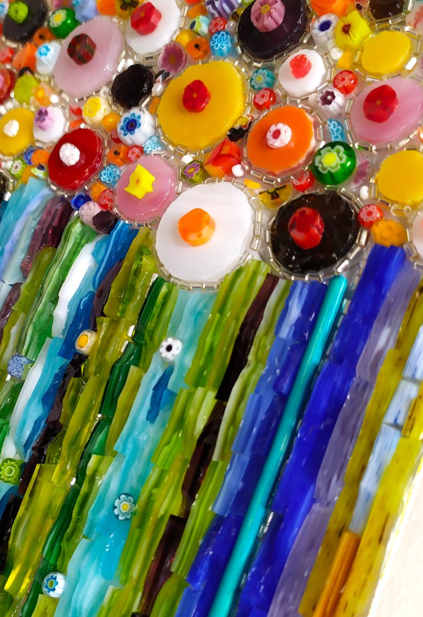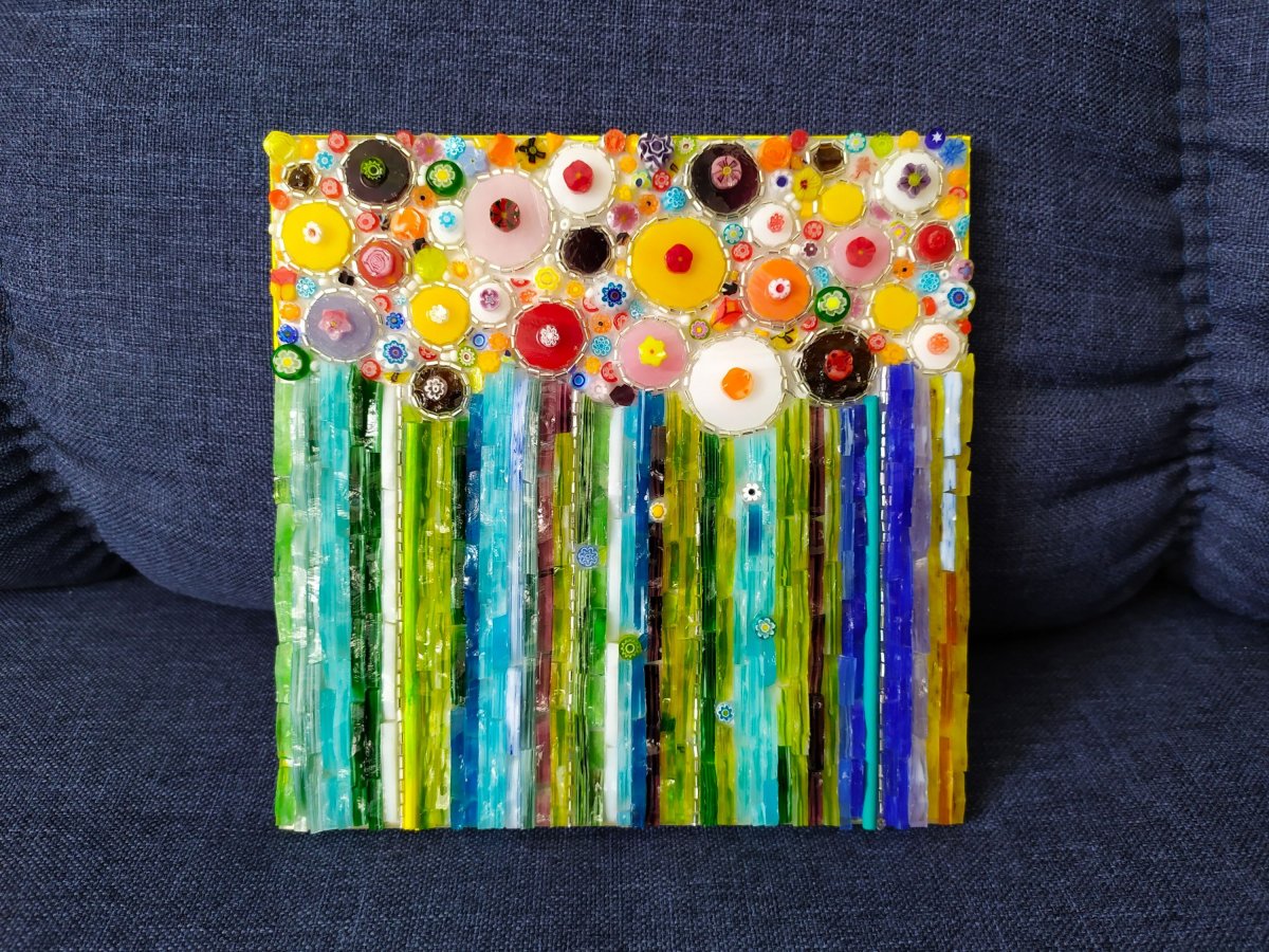 Originální typicky abstraktní skleněný obrázek. Hraje mnoha živými barvami. Je vybaven krásnými skleněnými korálkami tzv. " Millefiori - tisíc květů " . Kytičky jsou různě barevné . Každý kousek skla je vlastnoručně štípaný . Zajímavostí skleněné mozaiky je, že na slunci a denním světle dostává pokaždé trochu jiný odlesk. Záleží vždy na intenzitě světla.
