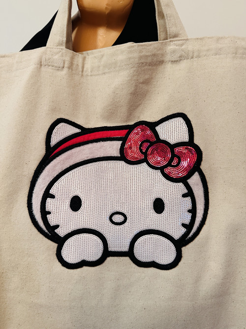 plátěná silnější taška s nášivkou, délka od ramene 55 cm, šíře 40 cm, délka 38 cm.