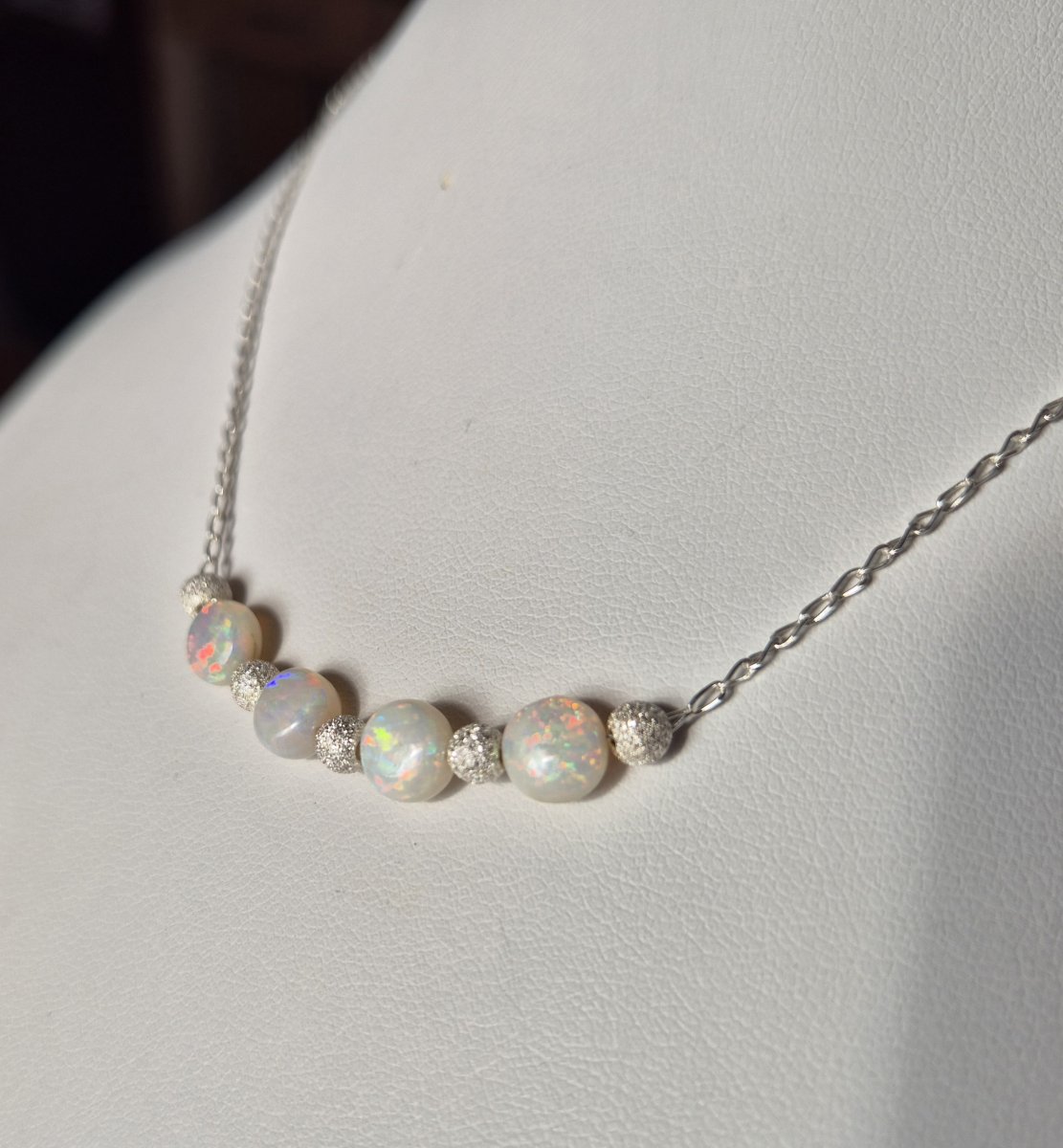 Stříbrný náhrdelník s přírodním australským opálem. Rozměr opálků cca 7x4 mm. Mezi opálky stříbrné kuličky o průměru 4 mm. Celková délka 44 cm. Opálky jsou přírodní. Na jednom zbytek mateční horniny. Patrné na fotce.