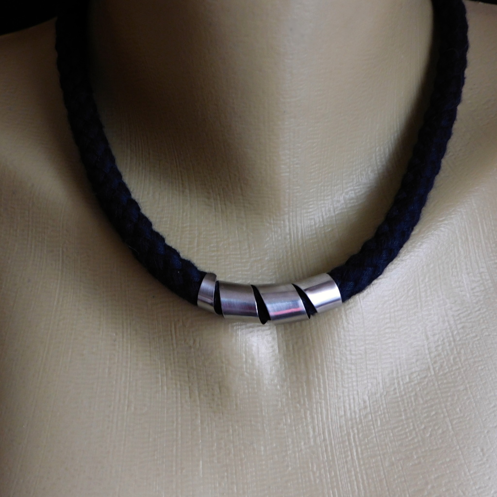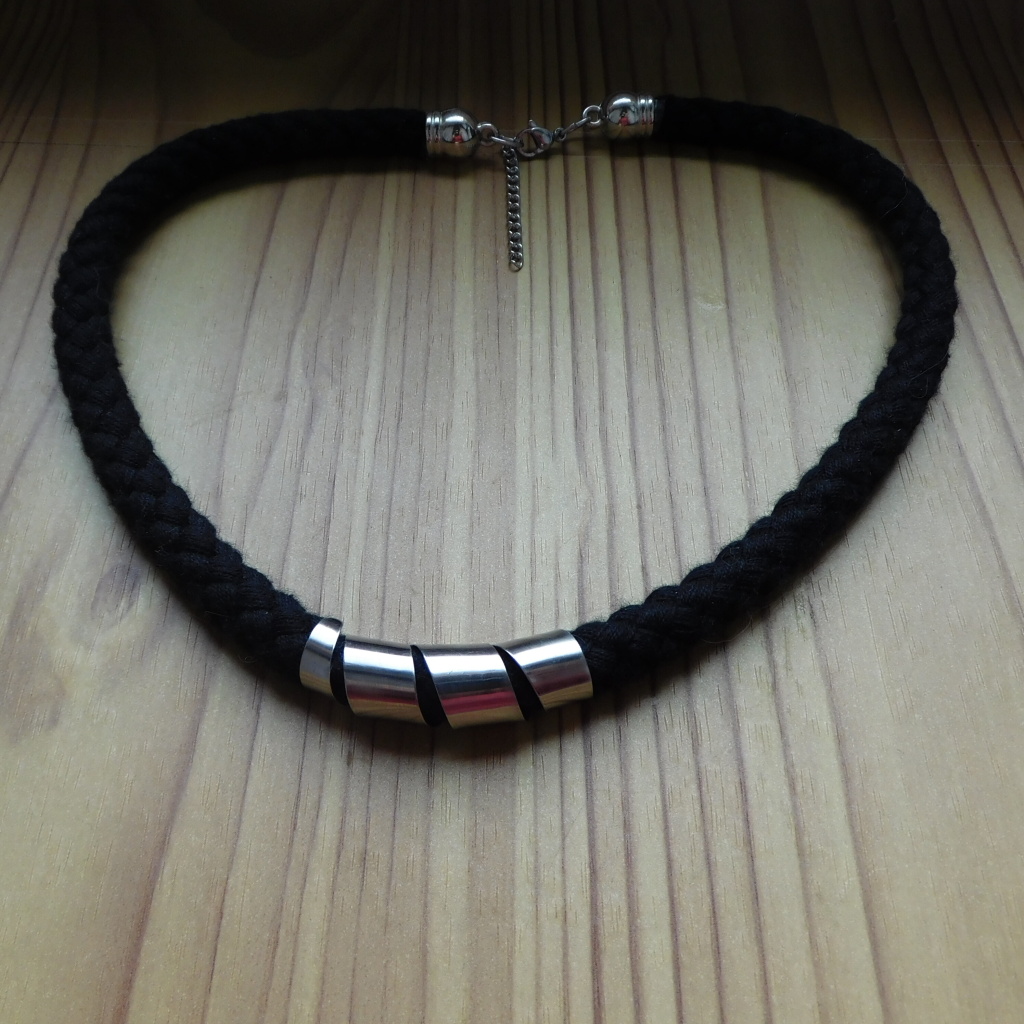 Lanový náhrdelník z černého lana a ozdobné ručně vyrobené, leštěné trubičky.