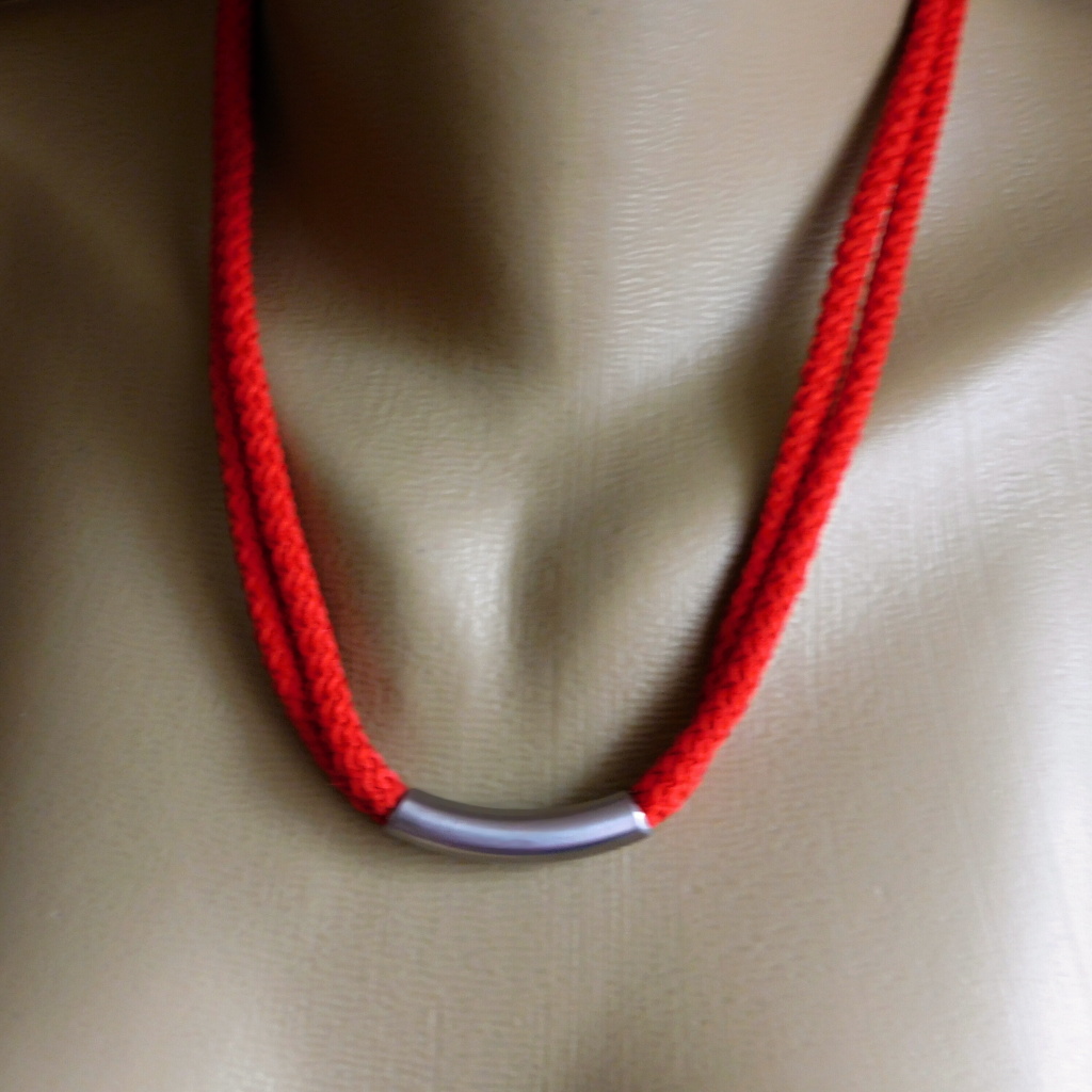 Lanový náhrdelník z červeného dvojitého lanka ručně vyrobené, vytvarované leštěné trubičky.